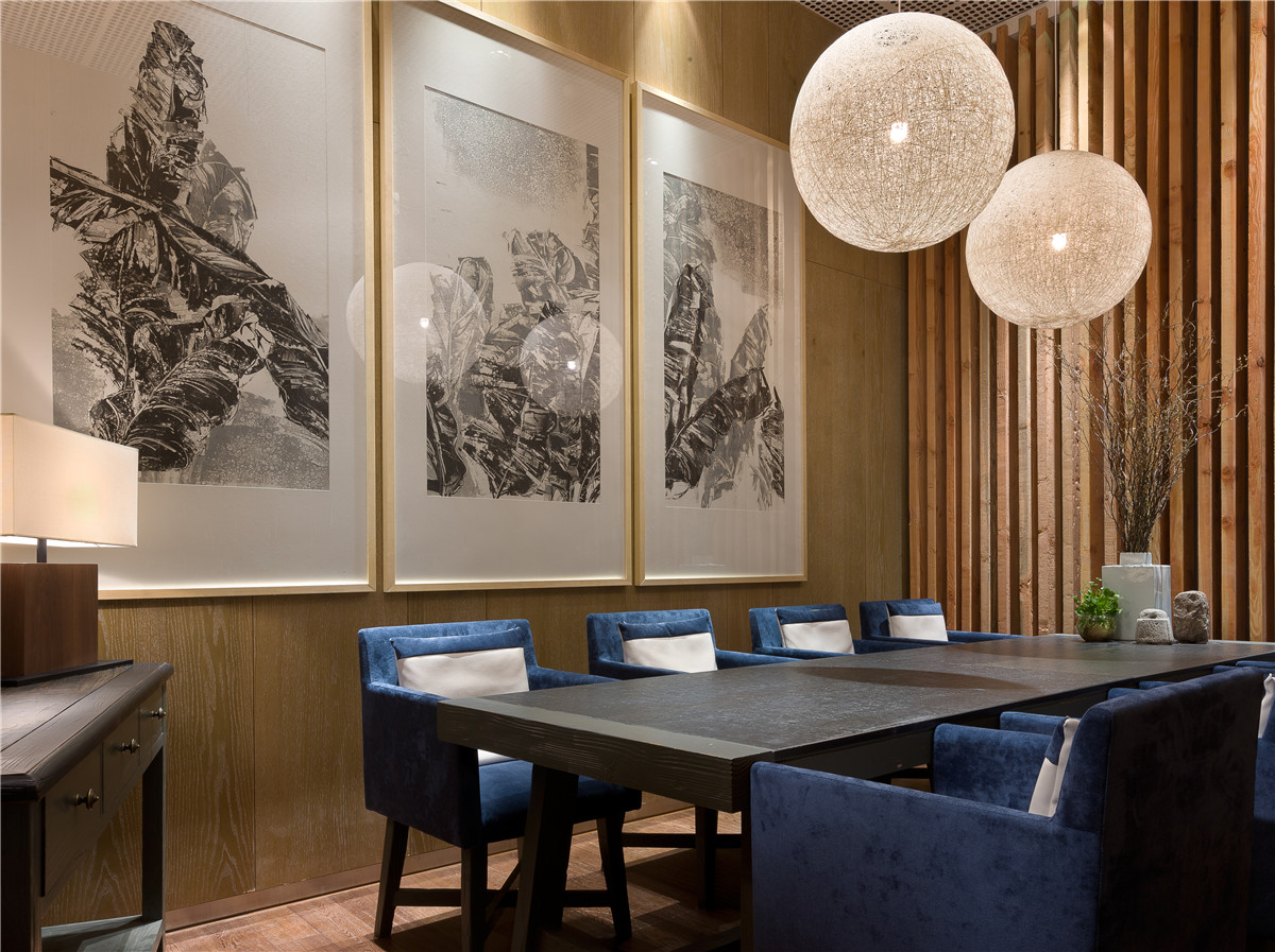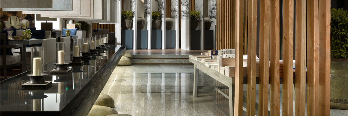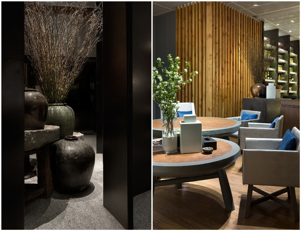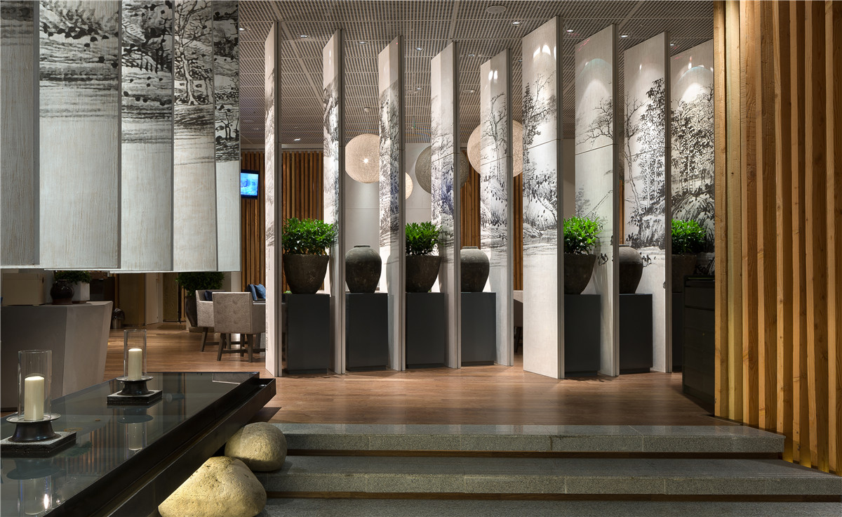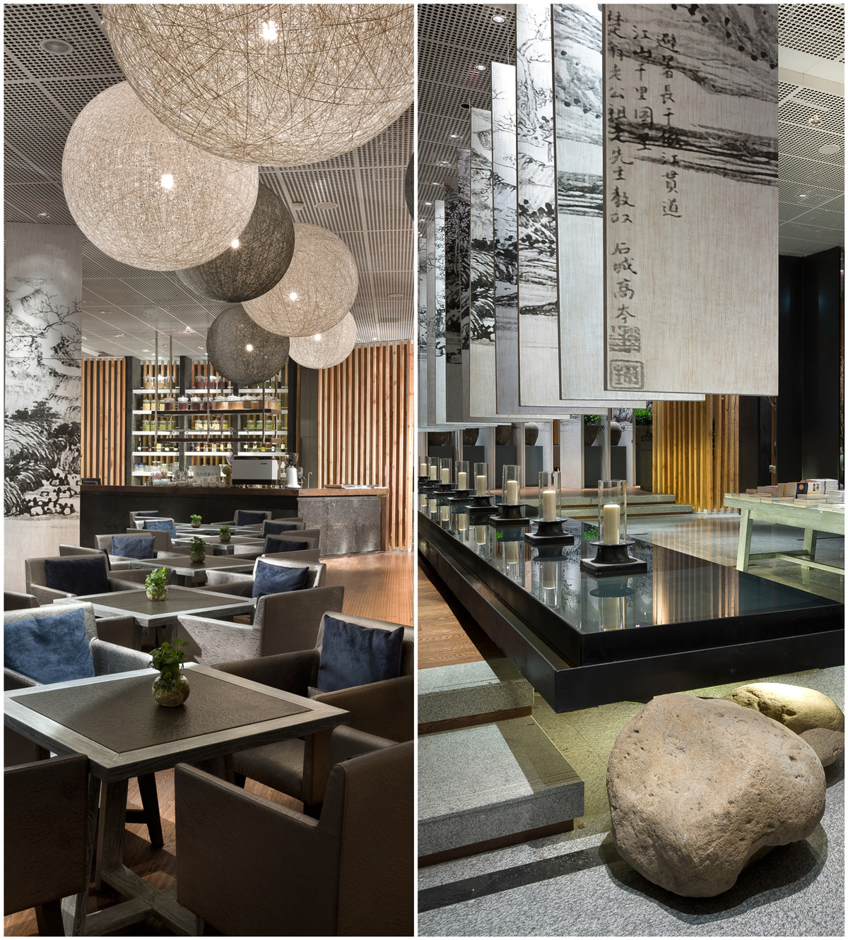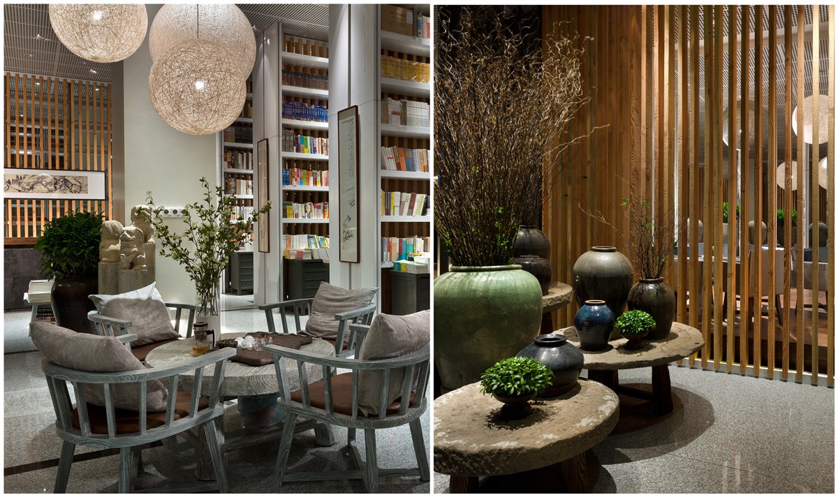 本项目为多业态组合,风尚趋静的业态,为都市小资目标客群属地。所以在空间营造上趋于简约明畅,同时亦在文化意蕴上有所彰显。首先,非常规的楔形总平加上咖啡简餐、书店、创意产品的组合业态,决定平面布局与空间动线处理上,要采取相应灵活创意。于是,通过大量斜线切割手法,并在虚实相间的隔墙、仪式感强劲的条形水景的自然区隔中,使各自业态属性获得相对的独立感,又在视觉逻辑中行气浑然,隽永的基调得到通盘贯彻。其次,在文化诉求中,甄选了明清之间金陵八家之一的高岑的《江山千里图》进行了现代感的拼接,画风的简淡雅致,与清雅浑然的色彩、材质表现,在形式上获得了高度一致,同时回归、知性、情调、个性的江南文化价值亦清晰展映,徒生了空间品质感。最后,在陈设运用上,强调了对立与和谐,突出空间表情的丰富性,如朴拙的瓮、石磨、卵石、斑驳的老木头、轻盈曼妙的织灯、纤细的干枝、生态的绿植、小巧的文人山水小品等。