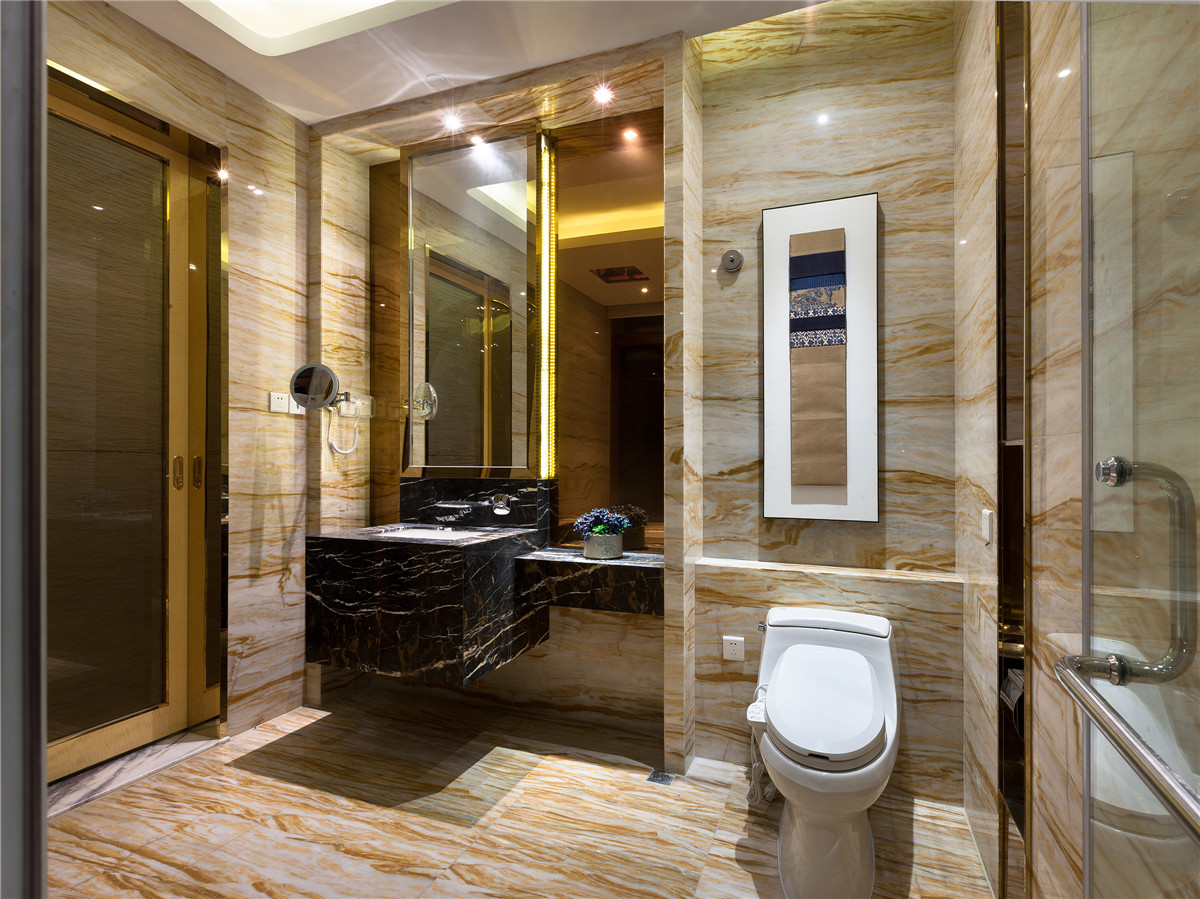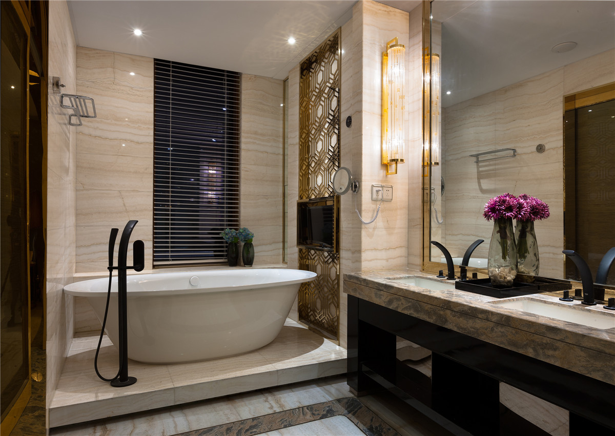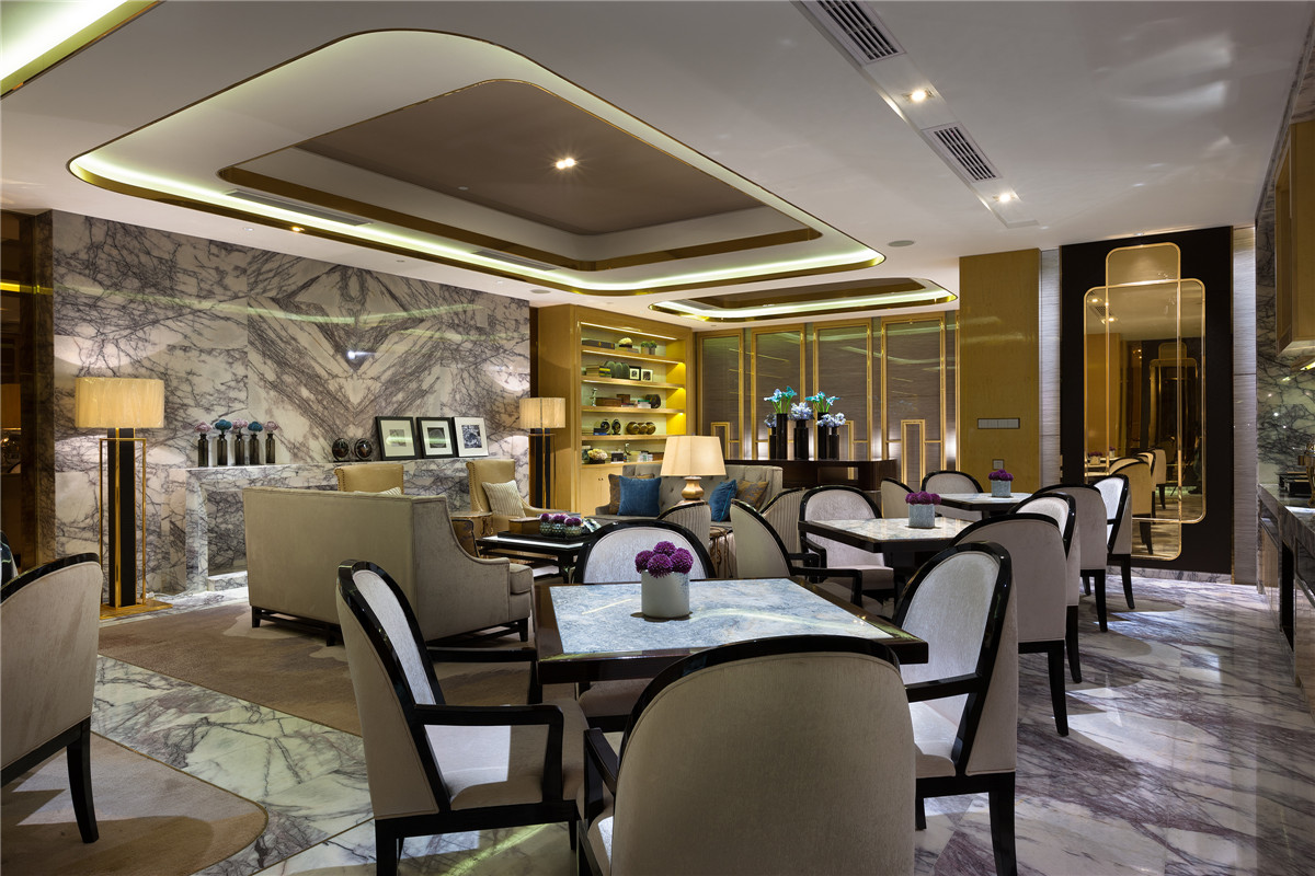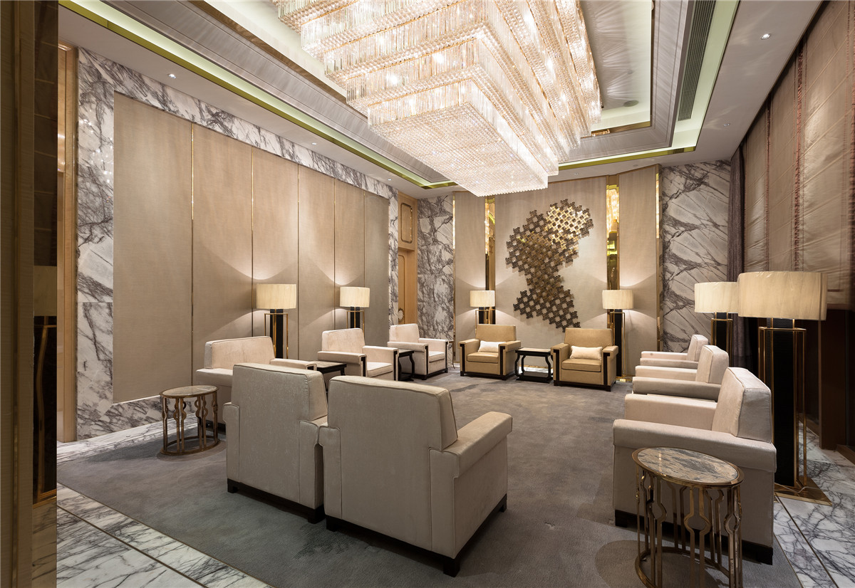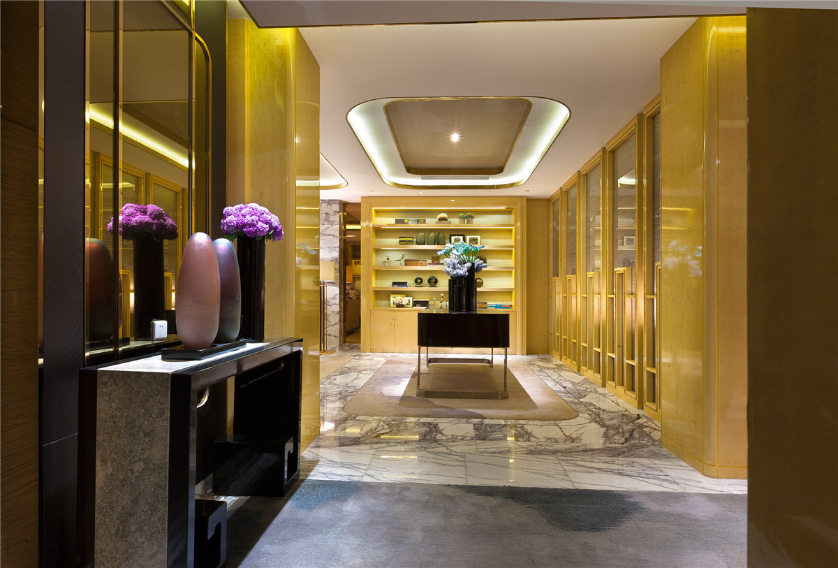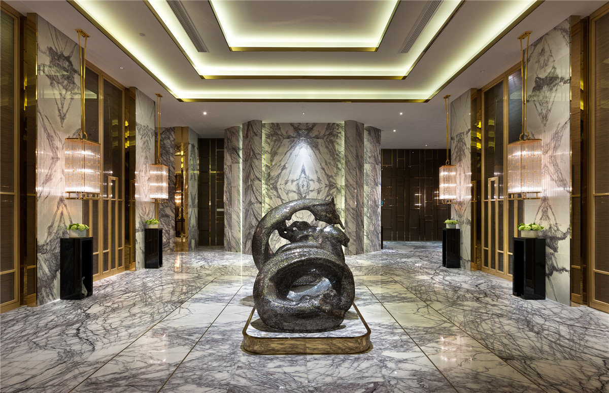 空间气质调性通过用材、用色、陈设诸方面获得清晰表现——一个融合品质感和低调的高尚族群身心体验之所。用材方面的设计表现尤为突出,“高级灰”的石材被广泛使用,特别是公共空间部分,其如山水氤氲的肌理灵动而富于诗意,散发着恬淡无拘的书卷味道,与“打造文化型特定族群社交现场”的定位暗合,凝净不失气韵,而在设计元素处理上,通过金属和色彩、形制丰富风格国际化的陈设,“和”与“贵”的中式精神亦得到含蓄表达,稳健、持重、深度、隽永空间性格得到了诠释,这正与定位精英阶层的目标群价值观和审美倾向保持了一致。