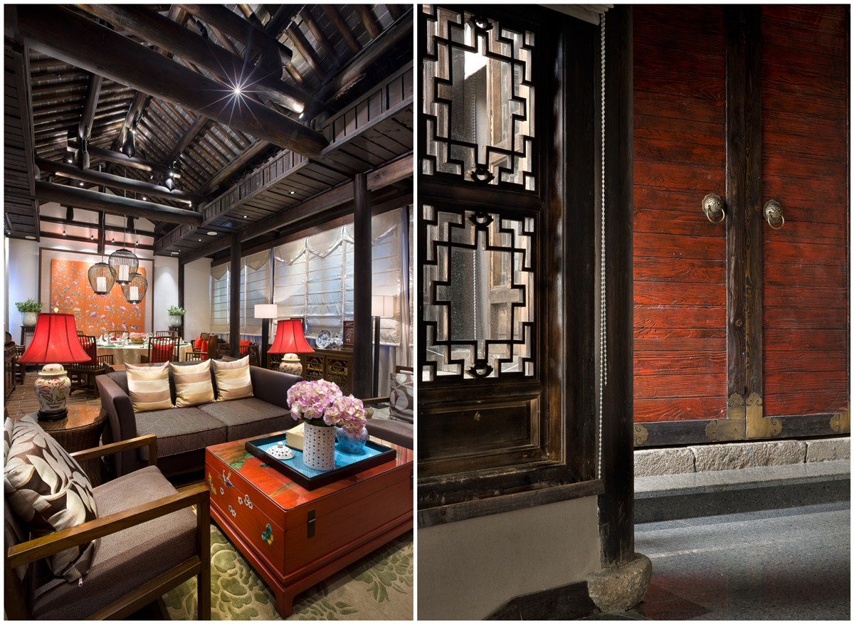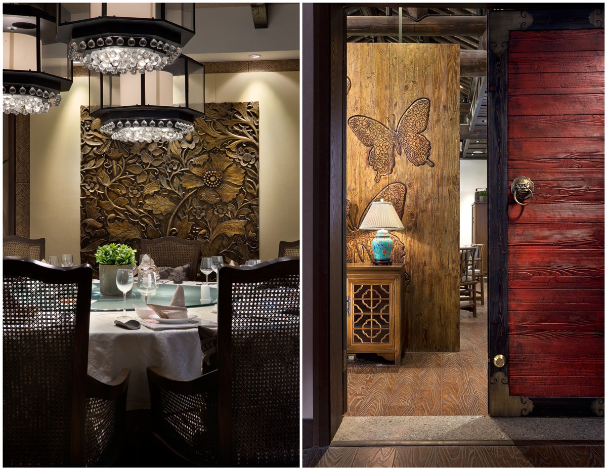设计过程是通过空间形象定位展开,首先是在门头、店招等外部元素上渲染古典氛围取得与周边环境的和谐呼应建立“景观饭店”概念,其次是通过典型中式元素与国际化主流色的混搭塑造属于人群的品位感,最后通过深色纹实木、浅釉陶瓷、吉祥纹饰画雕等细节表达营造出隽永而意味深长,增进饮食、交流的氛围,适合偏重私密性的家庭聚会与商务宴请。
