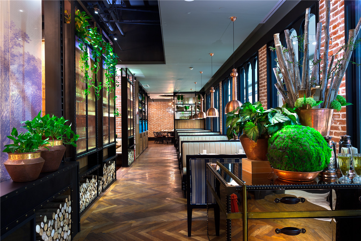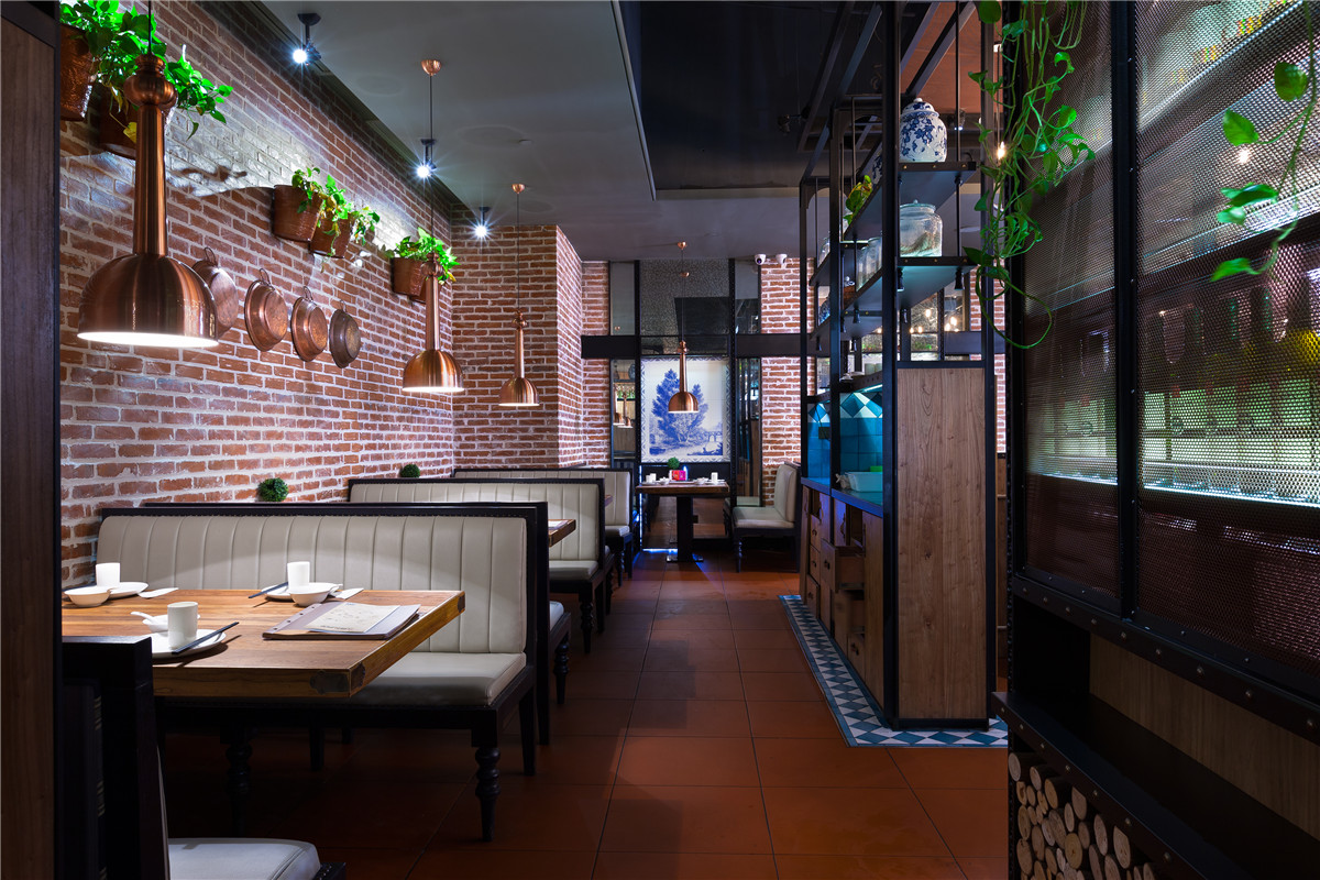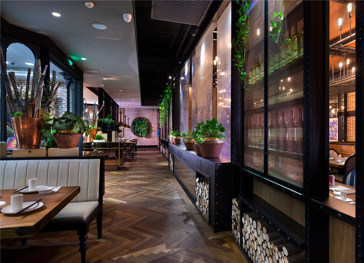 顶部伊始发亮金属的几何化处理散发着轻盈优雅味道,向下,横向、竖向的功能空间区隔,规则中有律动,并因深色色彩而获得稳重含蓄,再向四维发散,大幅西式单色风景画与贵族气的吊灯形成了顾盼,野性厚重的红砖成为暖色地面与中性色顶部之间的“过渡层”。