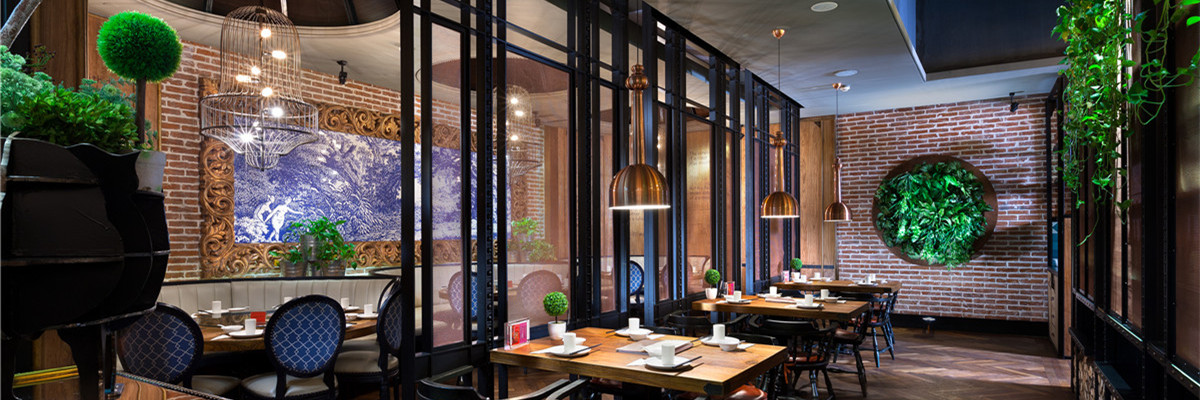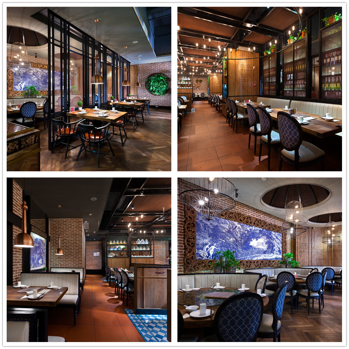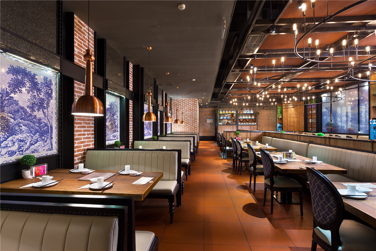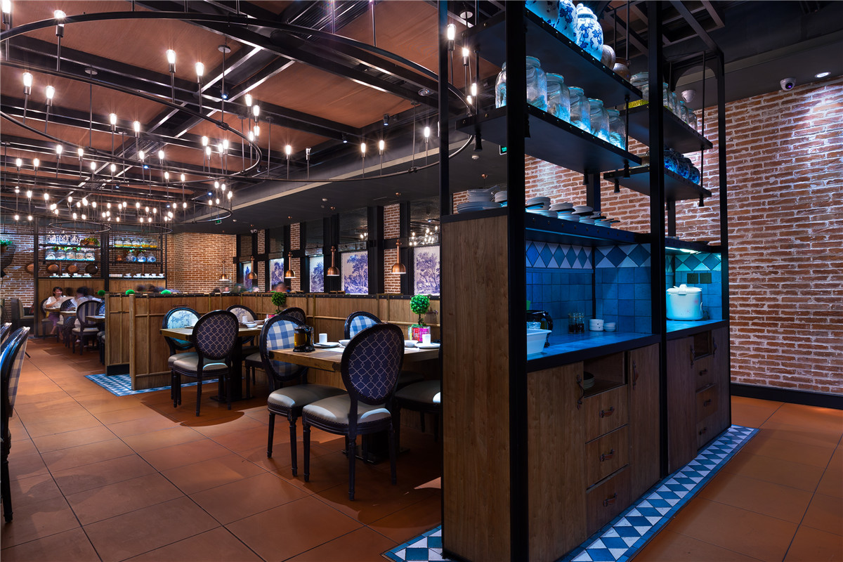 顶部伊始发亮金属的几何化处理散发着轻盈优雅味道,向下,横向、竖向的功能空间区隔,规则中有律动,并因深色色彩而获得稳重含蓄,再向四维发散,大幅西式单色风景画与贵族气的吊灯形成了顾盼,野性厚重的红砖成为暖色地面与中性色顶部之间的“过渡层”。