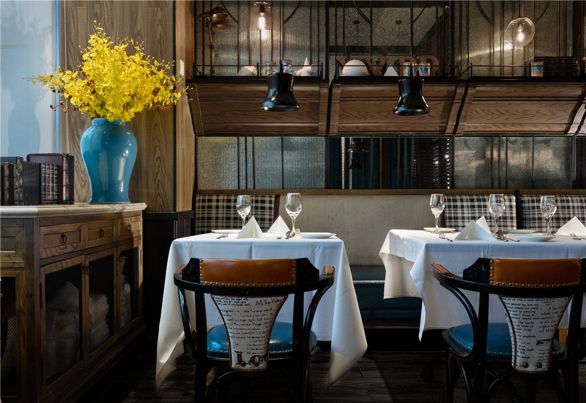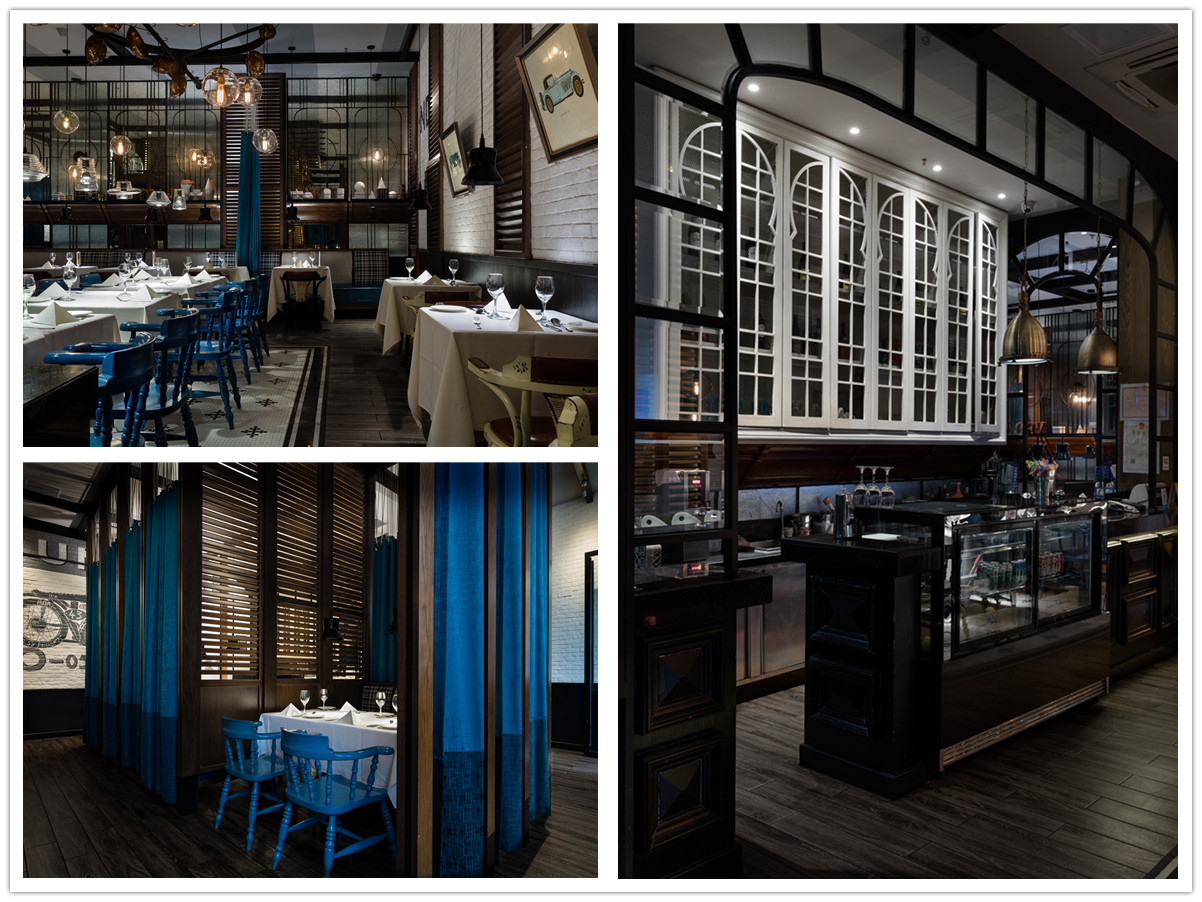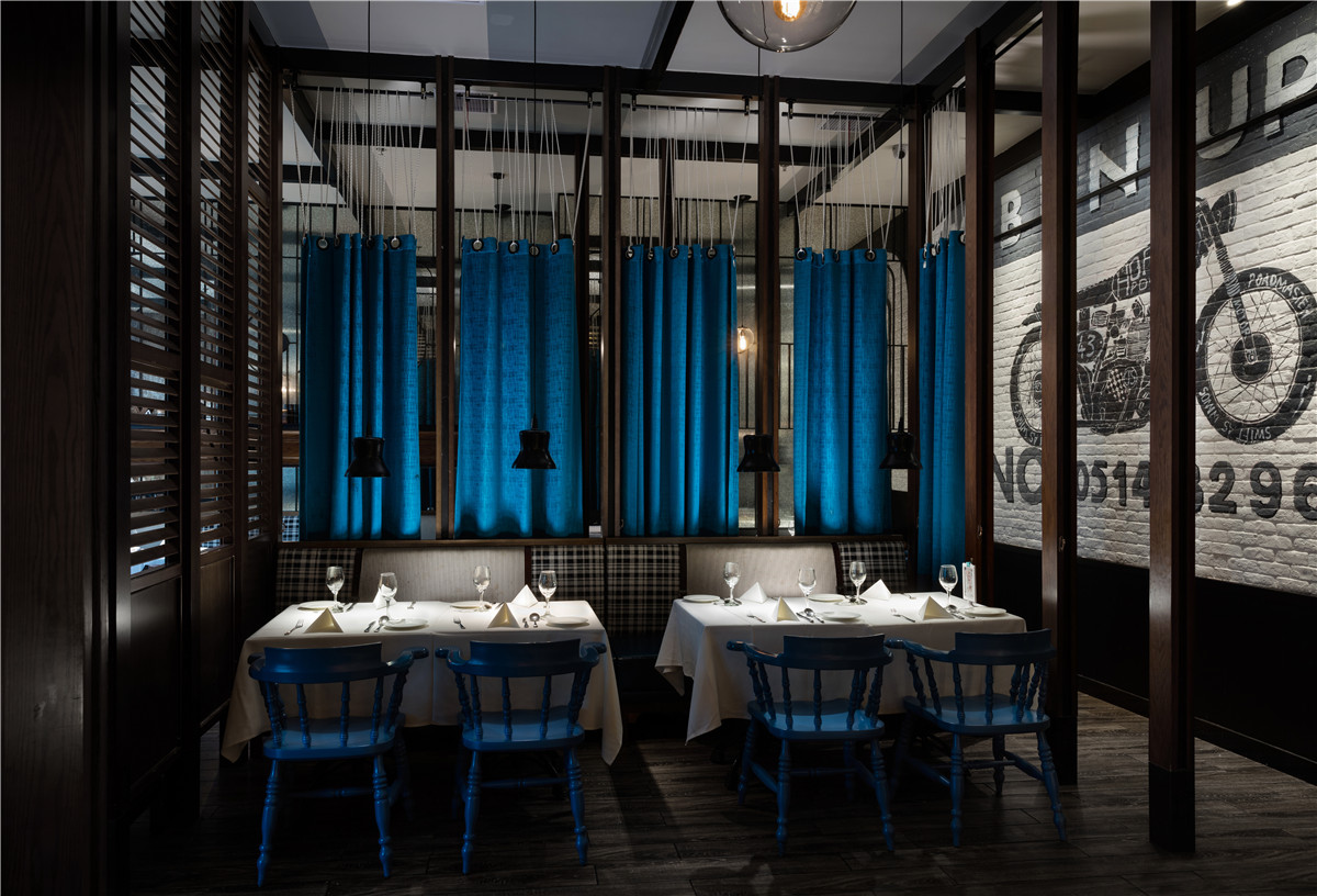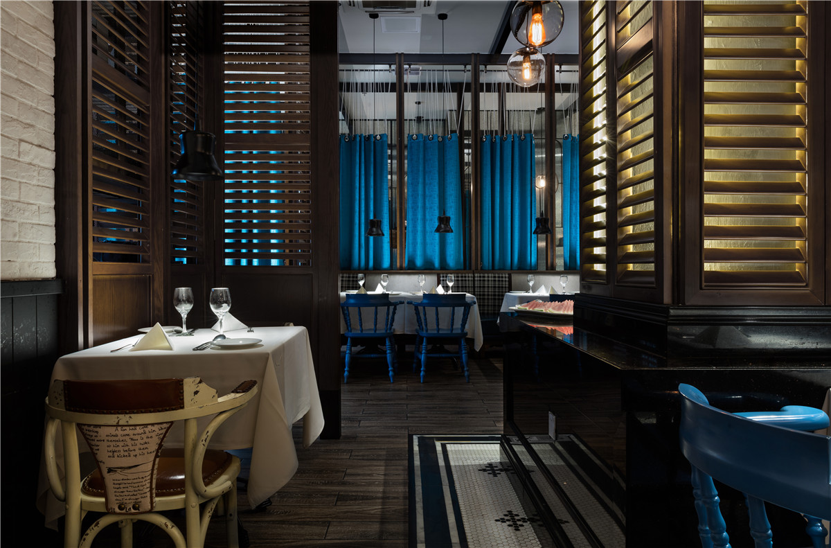 “西部公路电影”情结的精致化的空间表现,更突出“质感”与“性格”的传达,在“面色”上更具当代性,淡化了典型西部性格中野性和粗粝的比重,代之以酷酷的、劲爽的时尚腔调,俨然当代追求生活品质的新牛仔们旅程中的心情驿站。格栅、帘屏的交互跳跃,在虚实之间回应了当下目标客群在“社交消费”中的可开放、可私密的微妙诉求,垂帘屏风和餐椅的蓝、大纹水曲柳的黑、浮凸陶土砖上的白,互不杂糅,又因均为强视觉张力的感性色,而获得“不抢不跳”的视觉均衡。基于氛围塑造、文化传达、业态体验的考量,大块面的“西部”涂鸦,丰富多样的陈设系统、灯饰、和一些西式建筑符号的蒙太奇式运用,得到了充分诠释与演绎,围合成一个饱满的场景化就餐环境。
