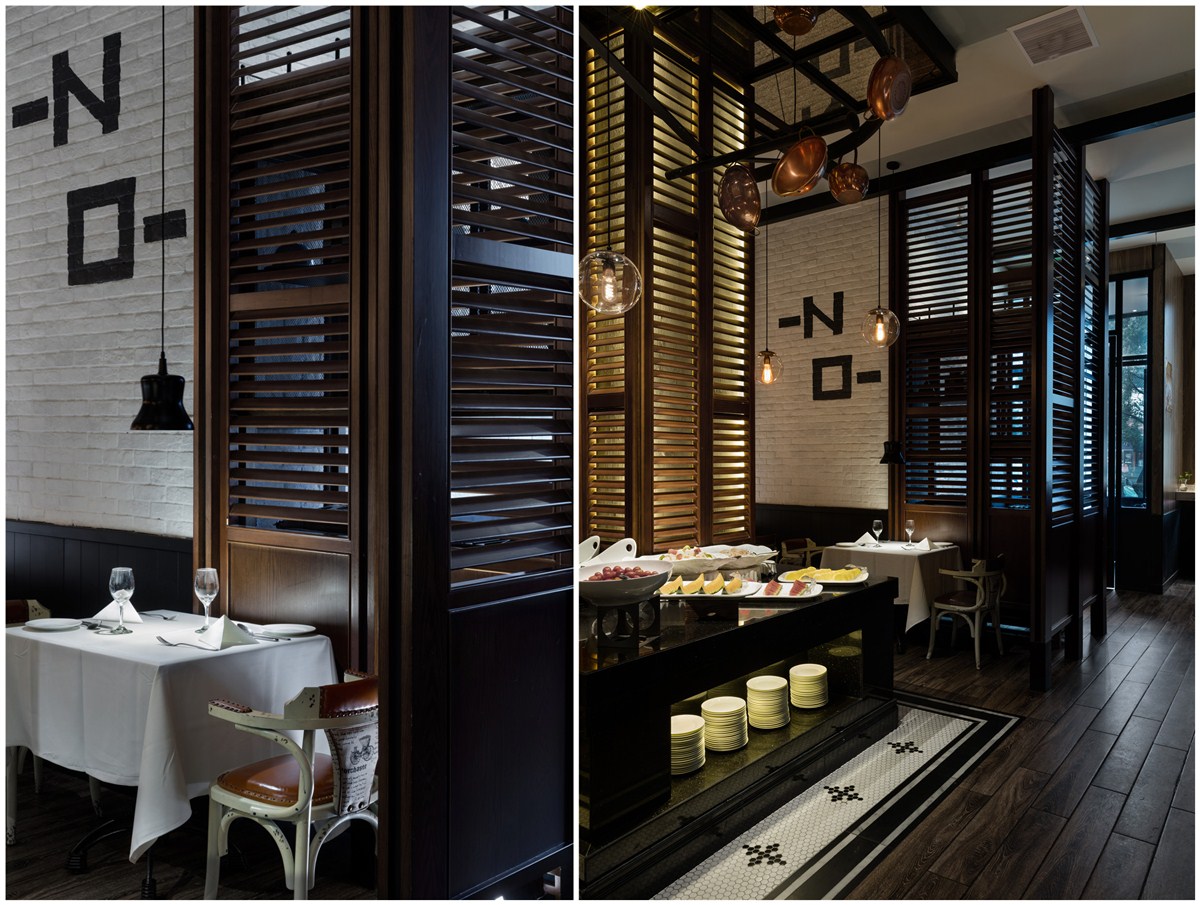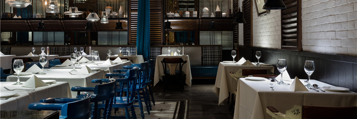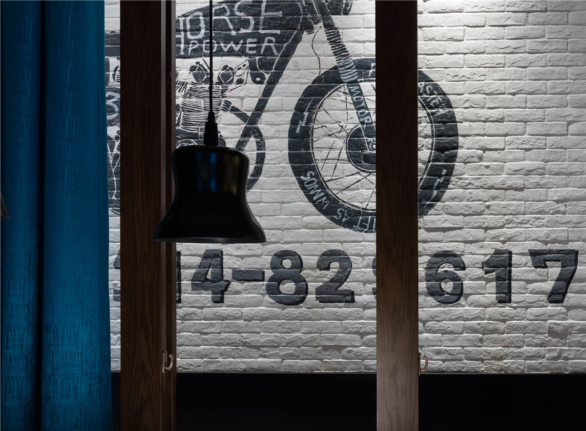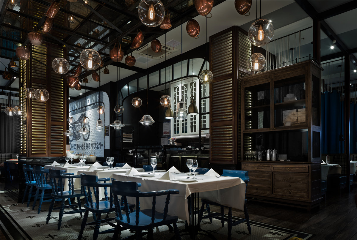 “西部公路电影”情结的精致化的空间表现,更突出“质感”与“性格”的传达,在“面色”上更具当代性,淡化了典型西部性格中野性和粗粝的比重,代之以酷酷的、劲爽的时尚腔调,俨然当代追求生活品质的新牛仔们旅程中的心情驿站。格栅、帘屏的交互跳跃,在虚实之间回应了当下目标客群在“社交消费”中的可开放、可私密的微妙诉求,垂帘屏风和餐椅的蓝、大纹水曲柳的黑、浮凸陶土砖上的白,互不杂糅,又因均为强视觉张力的感性色,而获得“不抢不跳”的视觉均衡。基于氛围塑造、文化传达、业态体验的考量,大块面的“西部”涂鸦,丰富多样的陈设系统、灯饰、和一些西式建筑符号的蒙太奇式运用,得到了充分诠释与演绎,围合成一个饱满的场景化就餐环境。