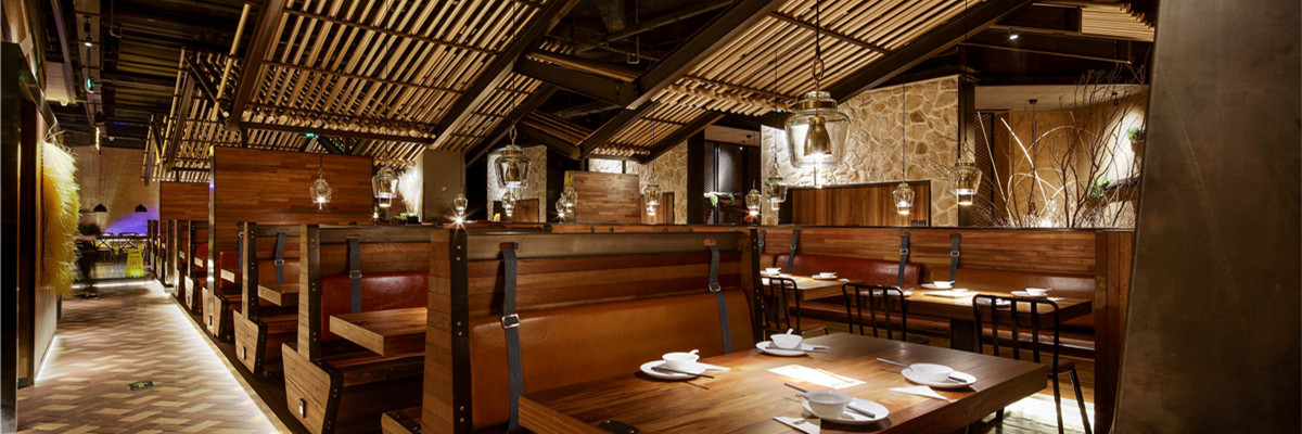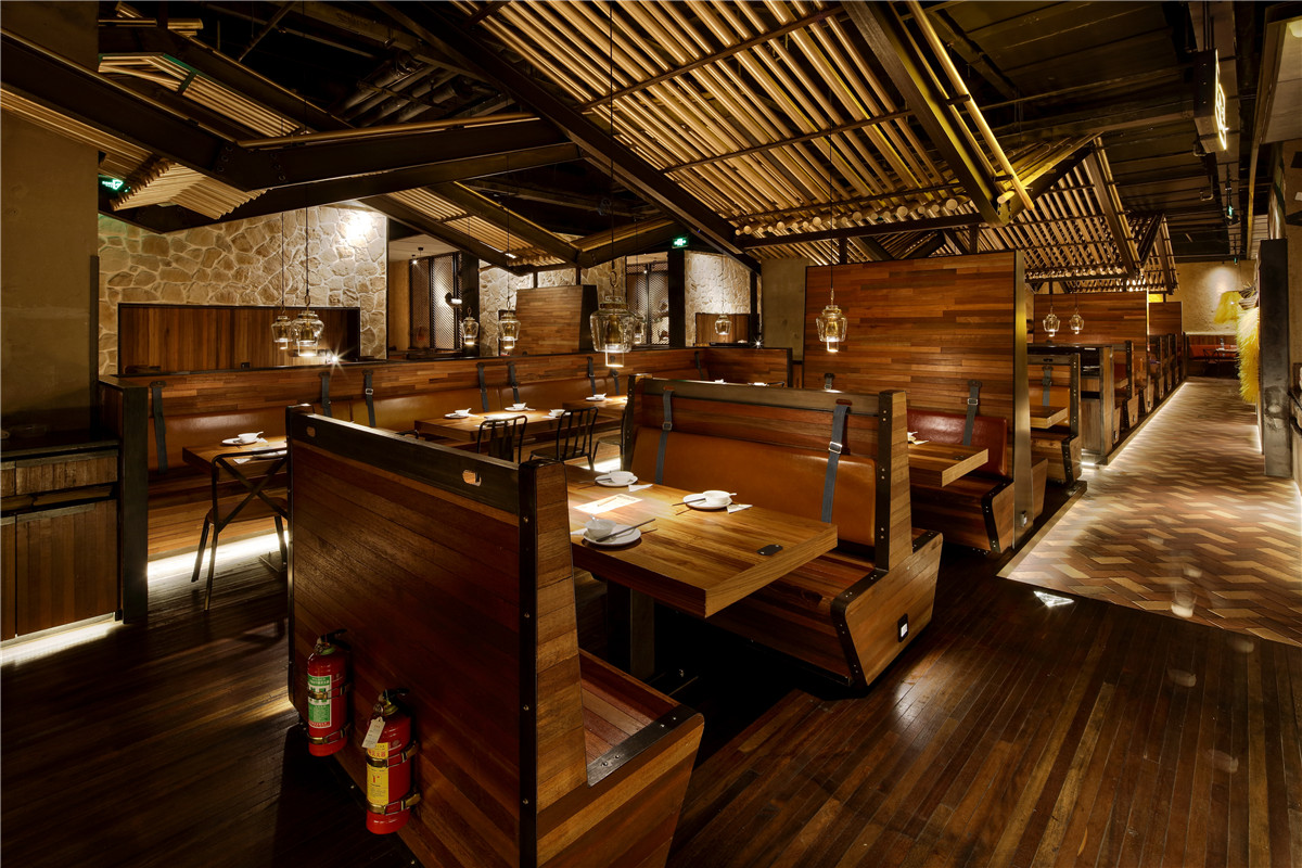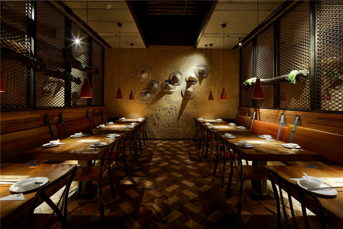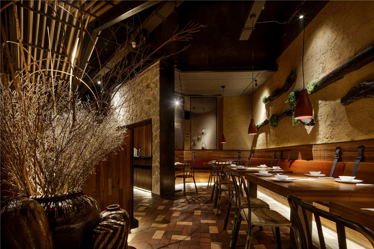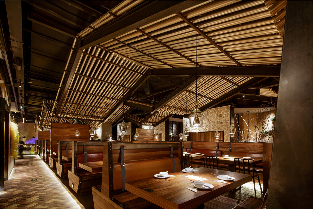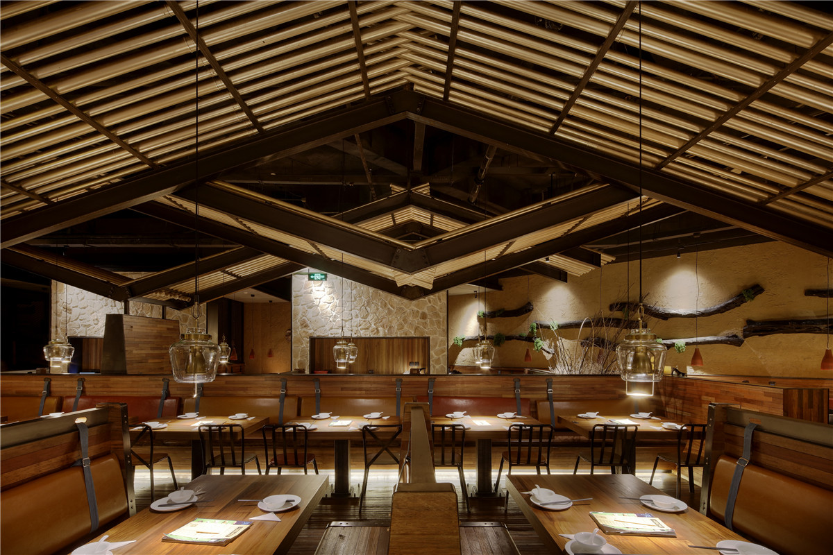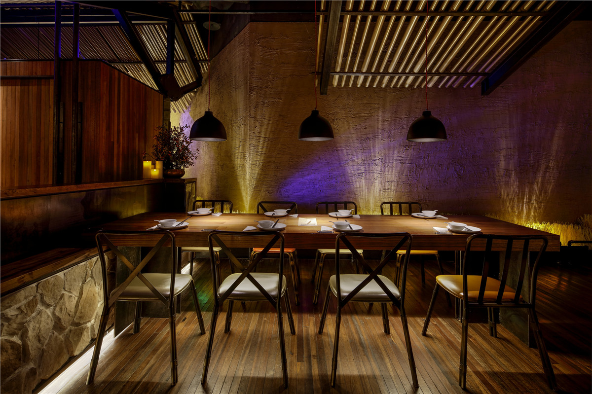 空间以夯土墙饰为主,墙面硬朗的线条,颇具建筑感的手法。空间简洁丰富,略显低调轻奢。在整体大色调的统一前提下,设计师用采用灯光调色,几处蓝紫色水纹灯光,使整个空间显的活泼而生动。空间吸引人眼球的”W”型顶极具戏剧感,乍一看,沉稳正经,慢慢观察,却发现一颗调皮的心。