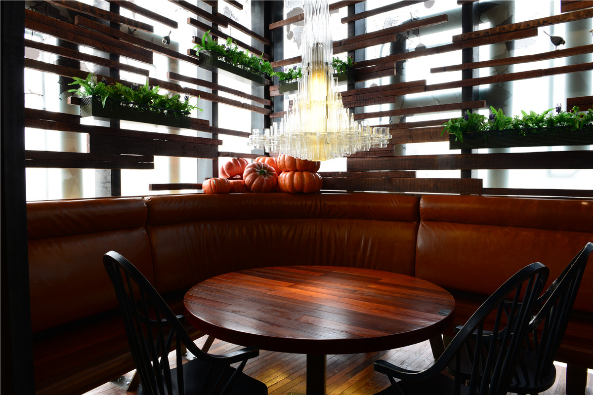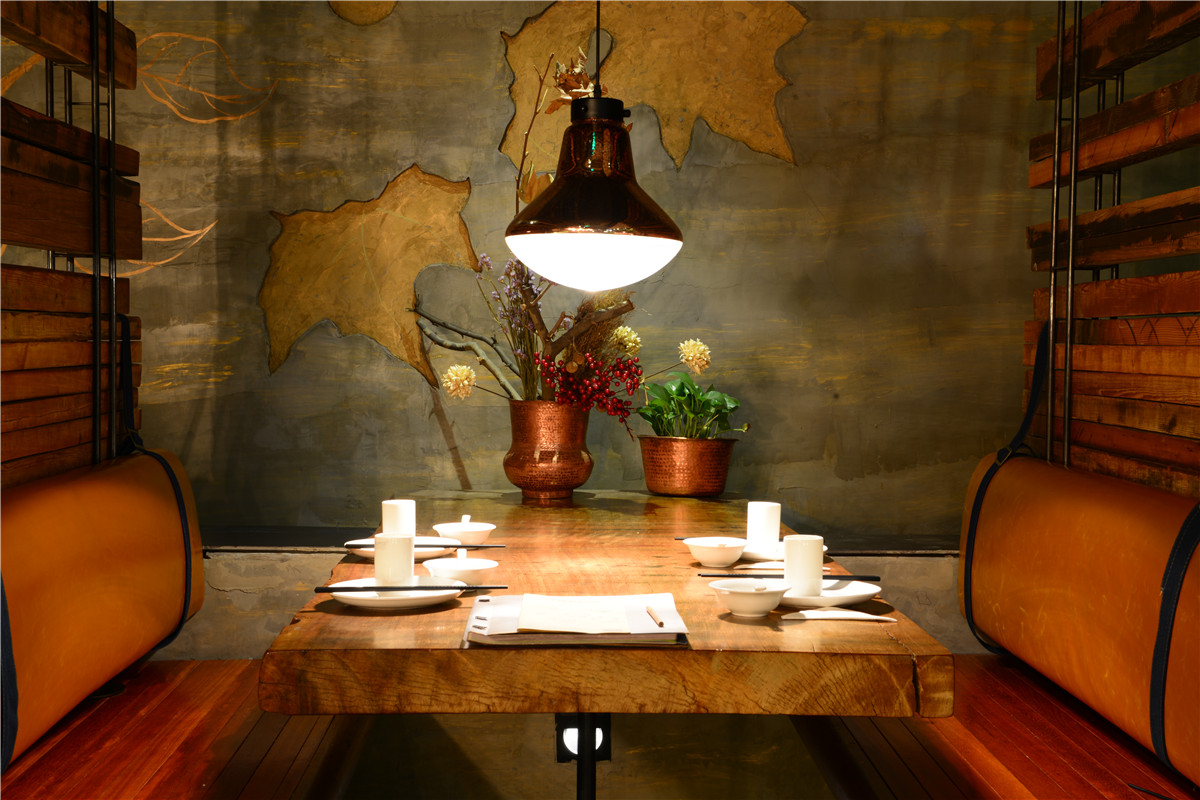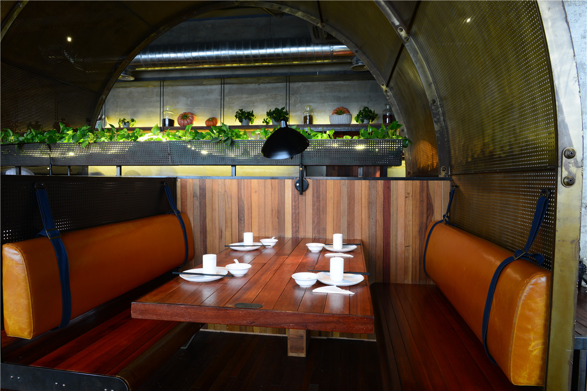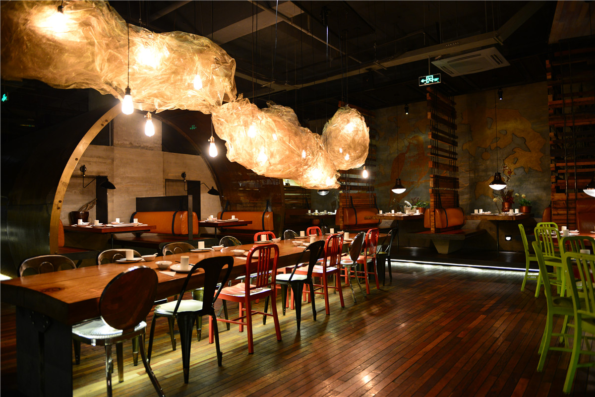 钢板与老木板以背景角色被大面积使用,斑驳古旧与粗粝的质感与视觉,犹如胶片里的岁月和难忘的过往;陈设与艺术品与空间基调异曲同工,朴拙而富余蓬勃的内在张力;细腻微妙的部分体现在空间布局的处理,用虚实相间、轻重配伍的手法,落实到“船蓬”到“帘垂”到平行“五线谱”的空间意向,创造出统一中有变化,写实中有写意、浑然中有节奏的业态空间效果。
