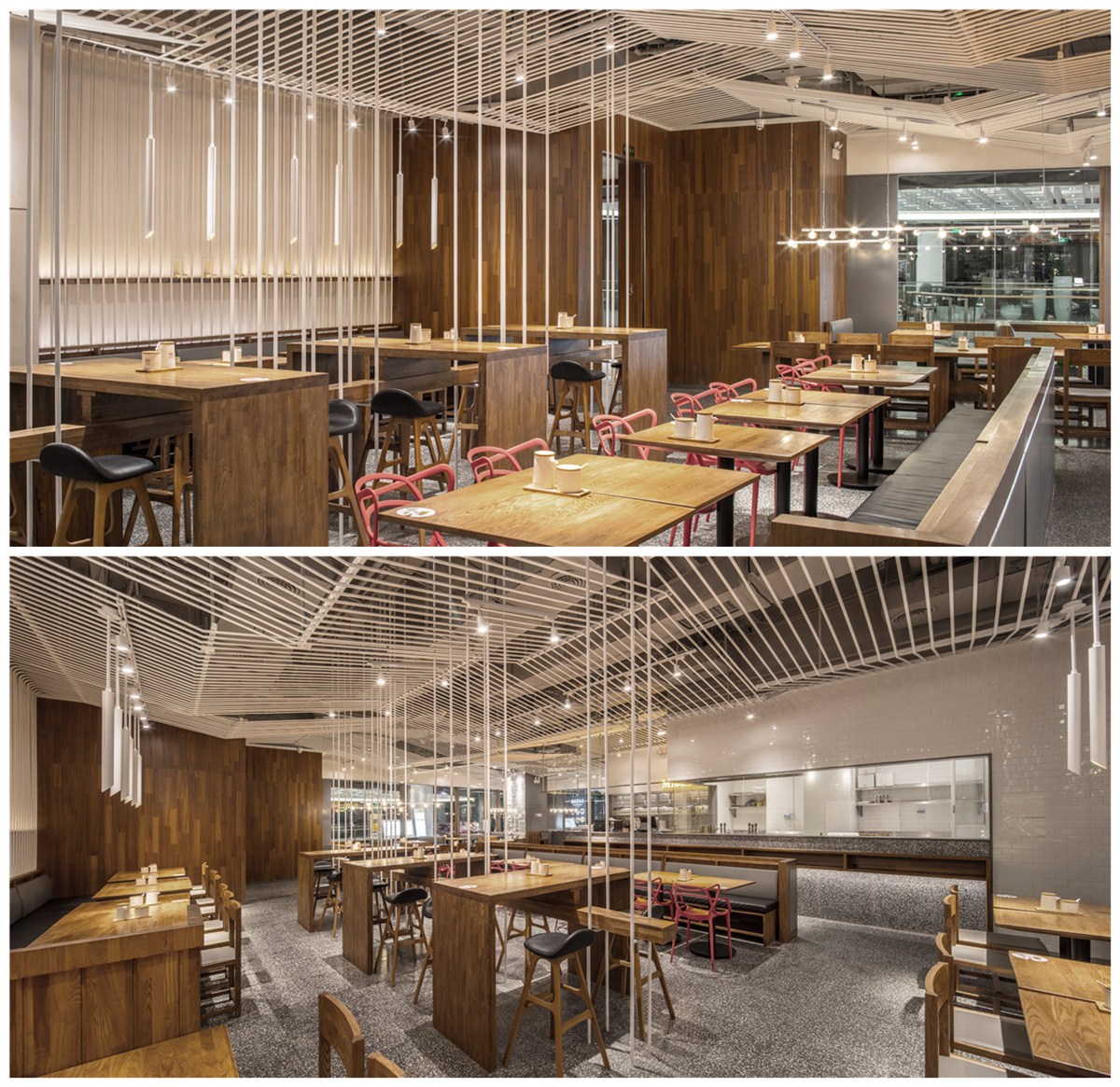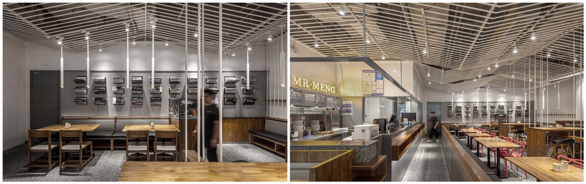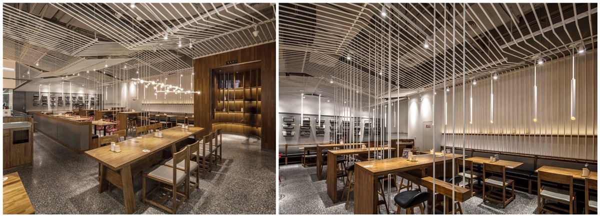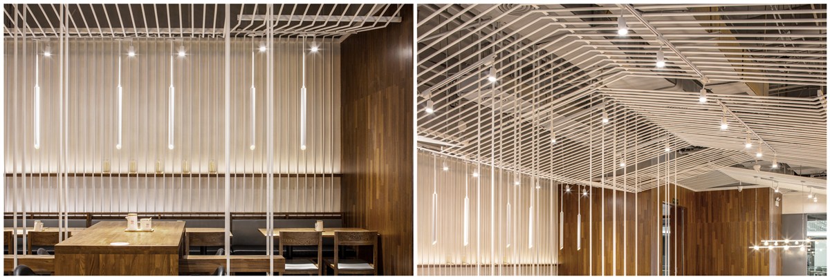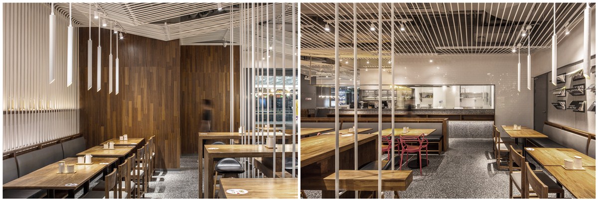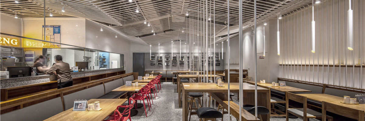 复合地板上墙、水磨石铺地简简单单搭建了面店的大基调,白色金属圆杆吊挂在头顶犹如“山城”重庆的层层山峦,起起落落、鳞次栉比。卡座区家具安静的坐着等待食客的光临;有着苏州绅士的内敛与儒雅,红色单椅乃点睛之笔,像一个个呛口小辣椒,宣誓了小面纯正的麻辣血统,似乎在跟食客们讲述着入乡所俗的故事;30个杂志装置在侧墙醒目的悬挂着,似读非读,在经意与不经意间流露出了骨子里的桀骜不驯 ,整个空间清爽却不过于淡雅,充满着年轻气息,很安逸。