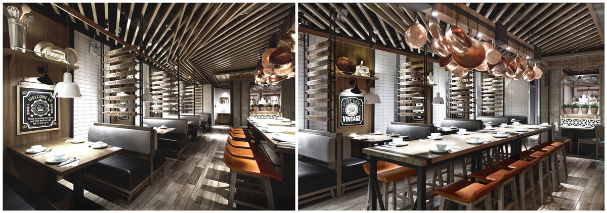 对营业性餐饮空间进行的一次愉快的“家厨”化演绎。空间注重了对趣味、节奏、休闲的腔调营造,灵动而富有乐感,空间切割变化多元并简洁干练,令不同空间呈现各异形式与内容体验,在元素演绎上,厨房用具和调味品获得了“重用”,情境感十足,并在浑然的素雅色彩、材质大背景中消解了“火气与出位”。整体空间温馨而散淡,情趣与品质感在国际化手法的演练中获得了鲜活体现,就餐环境充溢在亲和愉悦的氛围中。