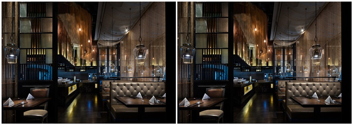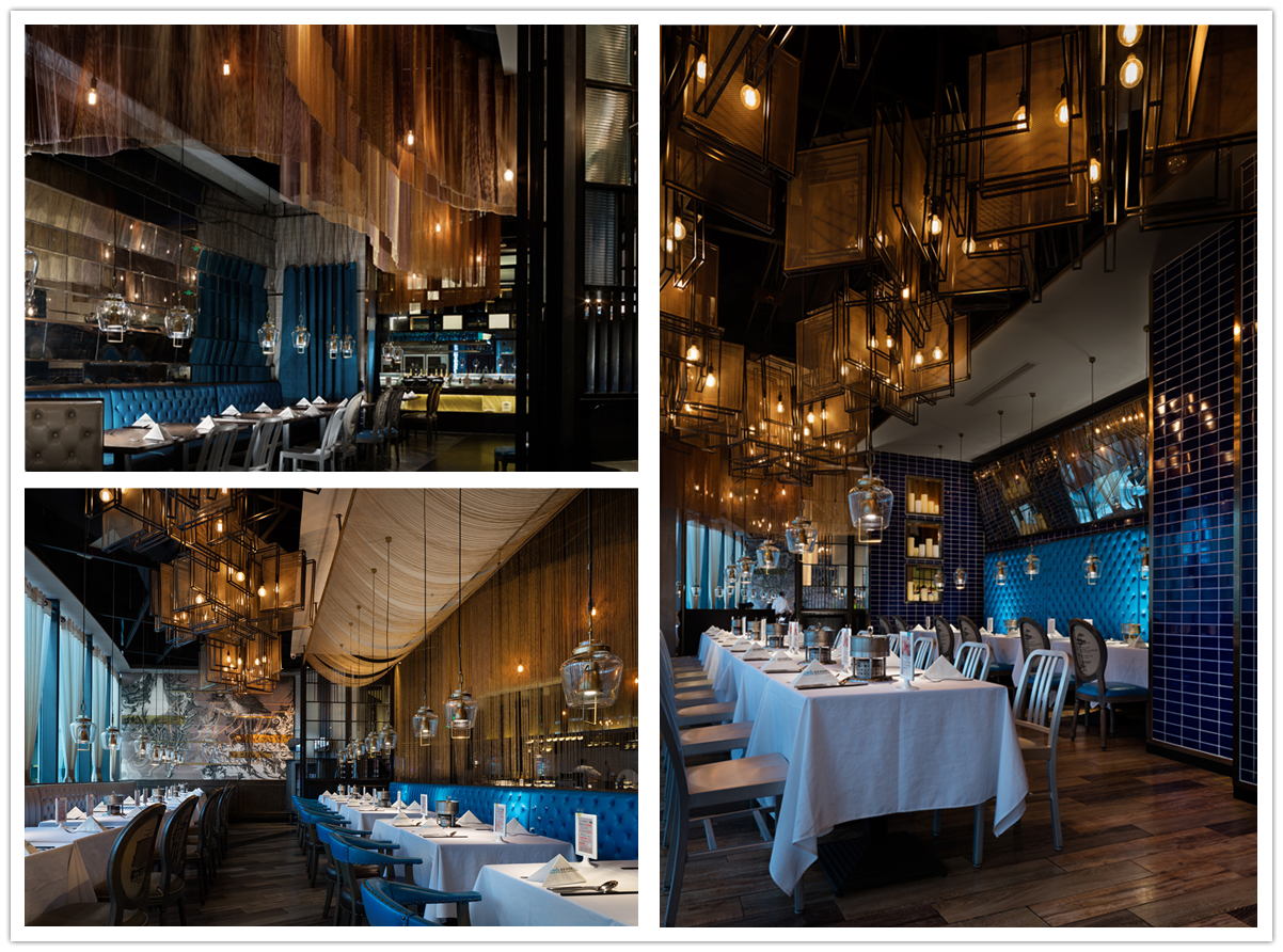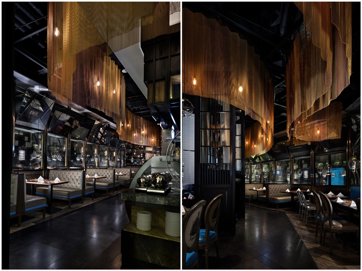 都会轻奢风格成为本案的本质内在底蕴,试图捕捉都市就餐环境的新感观体验,在空间中提取金属构件元素,将皮革、镜面、布艺、精美的艺术拼接及讲究的金属构造通过金属挂帘的线索巧妙的串联转化为视觉引线,令它们穿引在空间、装置、色彩、光影的序列之中,烘托出就餐环境温暖亲和典雅的气质,使空间整体气氛更为轻松自在。