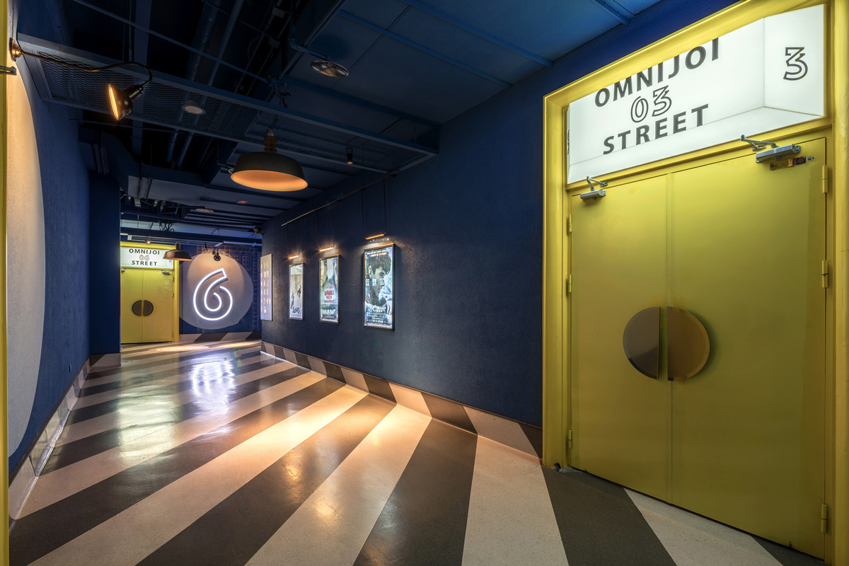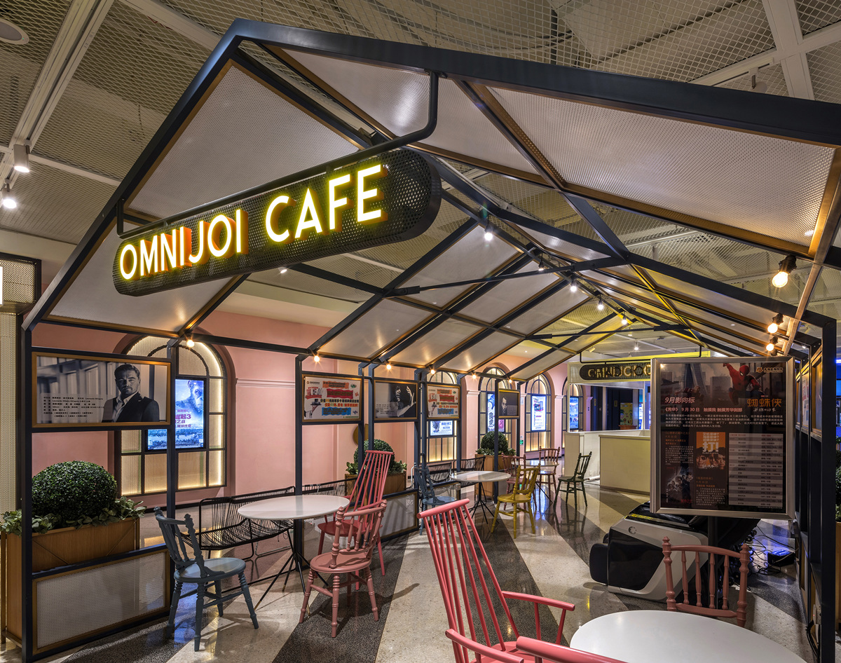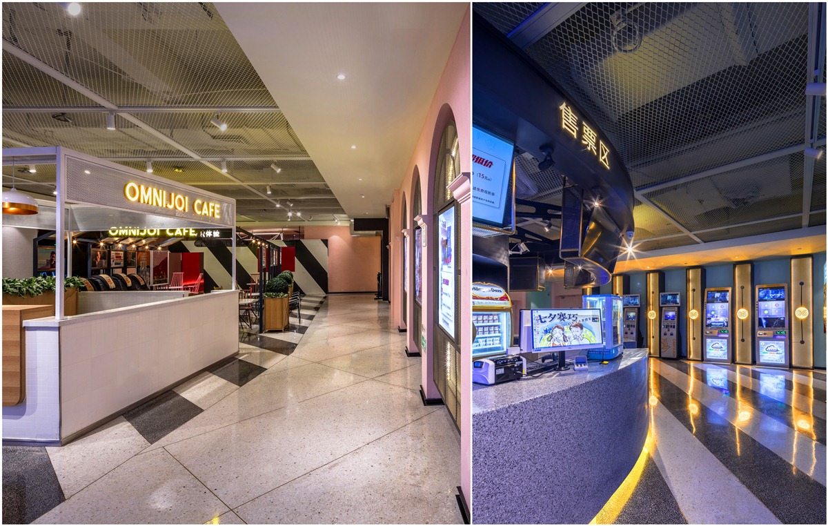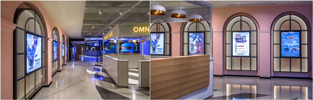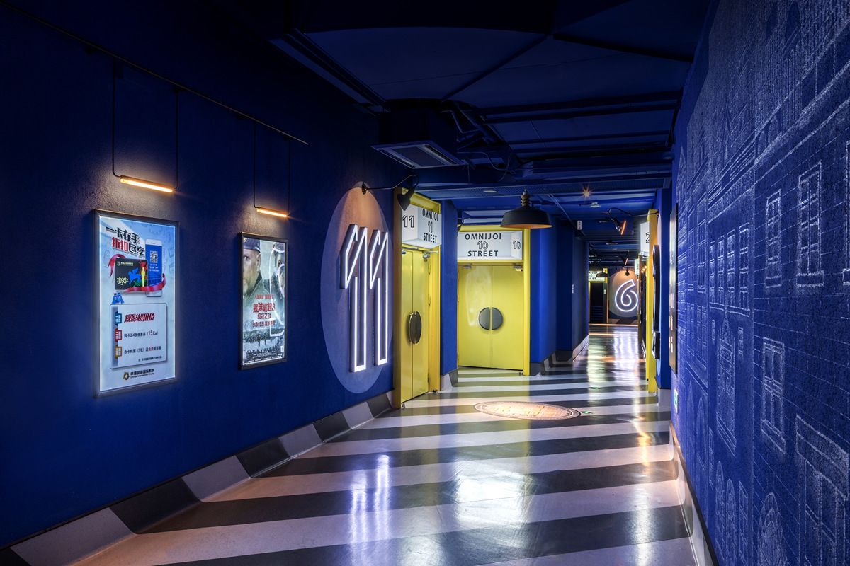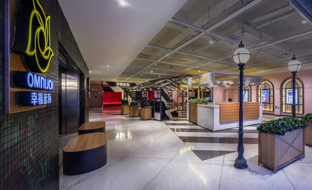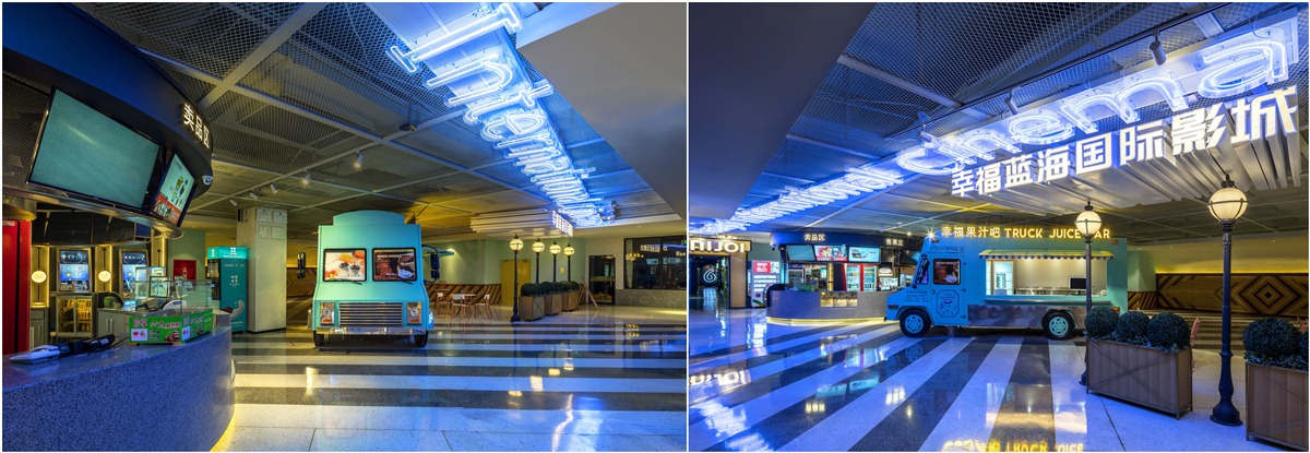 空间整体尺度偏小,大厅空间较为宽阔,小空间下并没有采用“影视”的语境特征,而是从个性化、趣味度层面突破。化零为整,运用生活化的场景元素,结合幸福蓝海的企业文化,形成“幸福广场+蓝海街”这一设计主题。