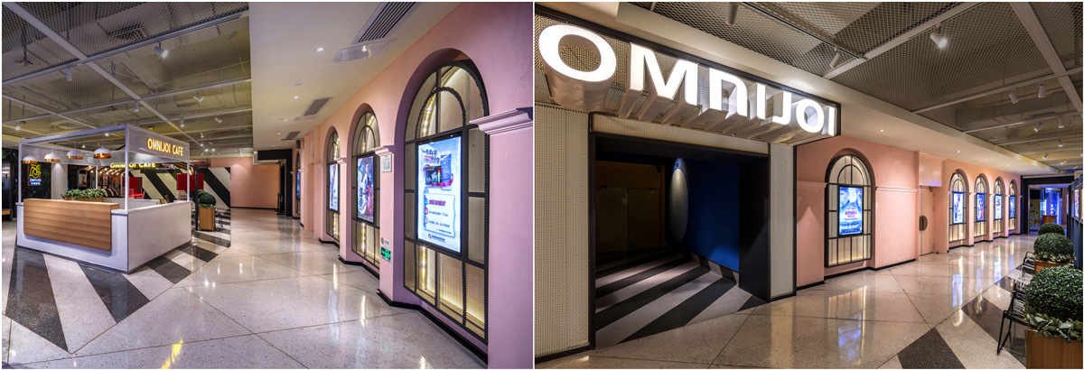 走进大厅,大巴车、路灯、店铺等实体化的场景表现形式,温馨小镇的情愫被牵动,进而引起入内探索的动机。步入走廊,场景化的街道形态贯穿整个空间。窨井盖、路灯、涂鸦等元素的运用,突出一个年轻时尚的街区空间。