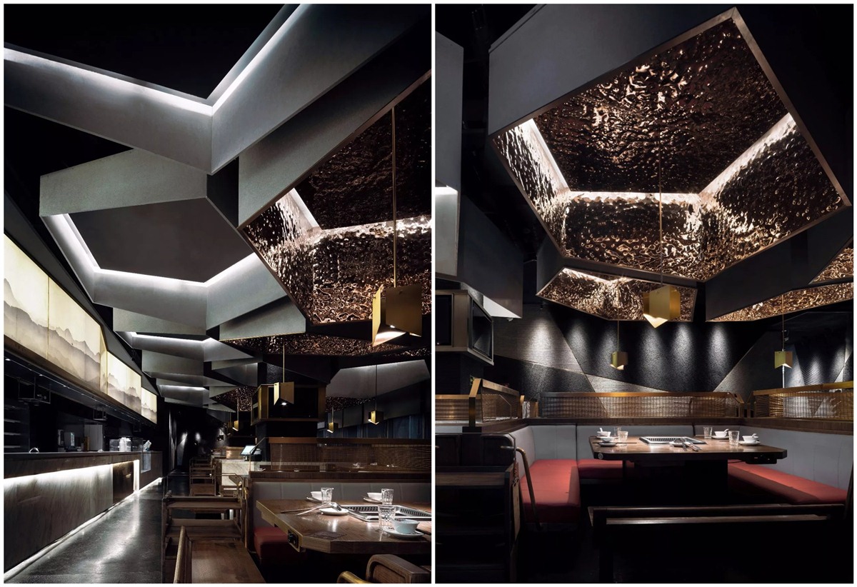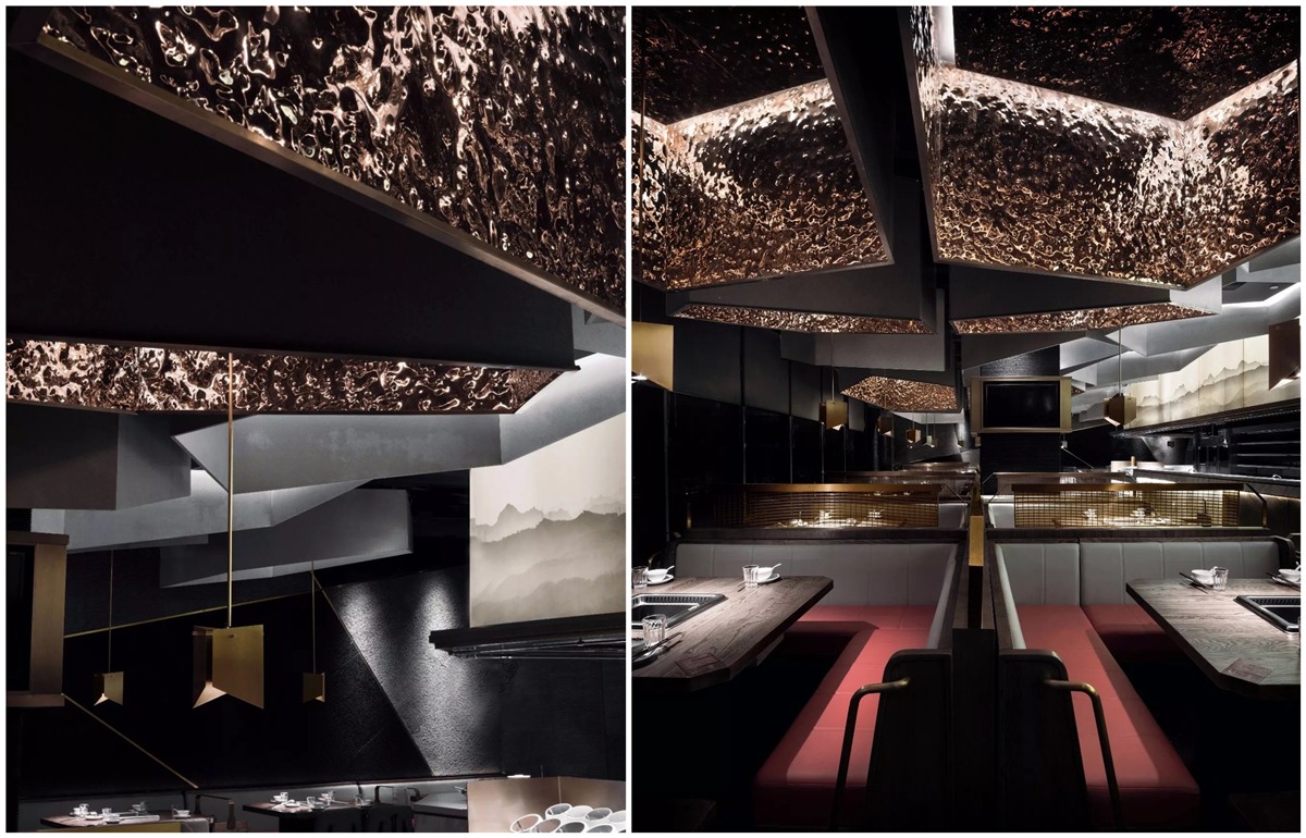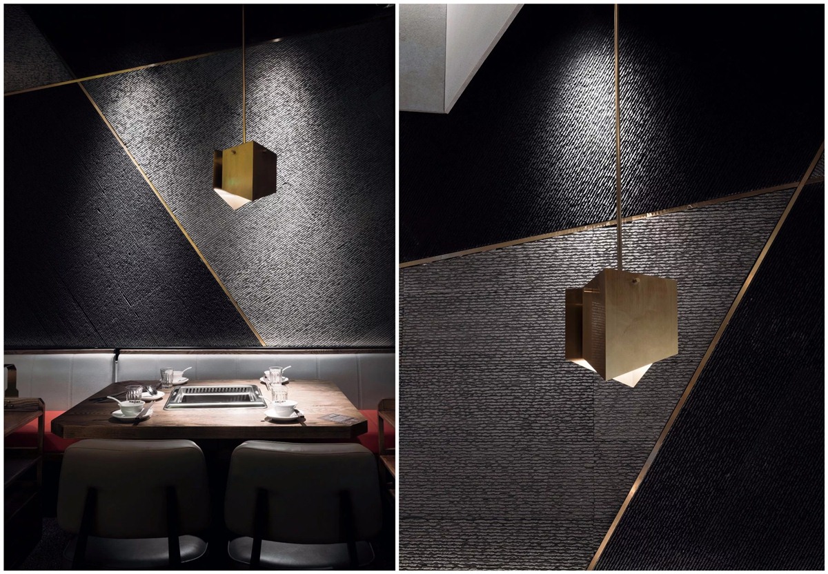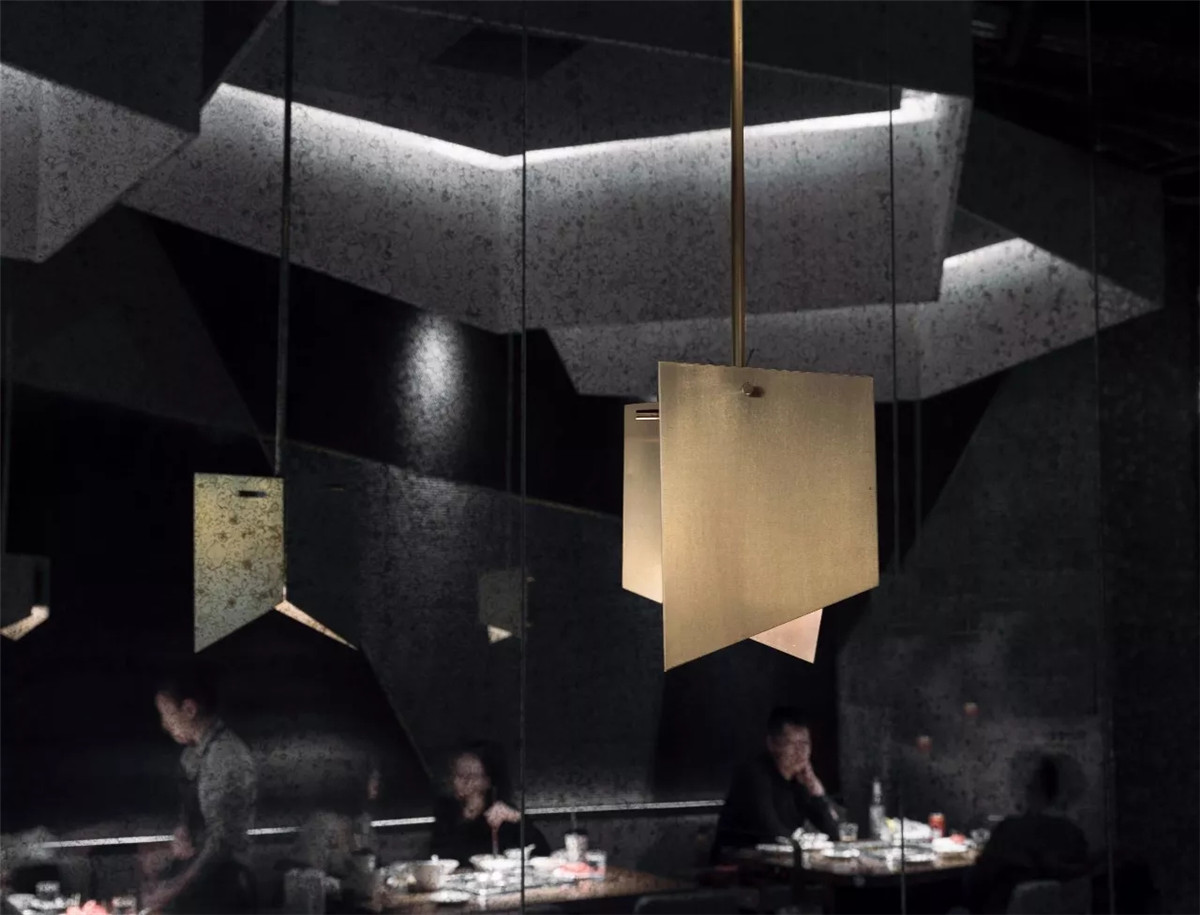 空间灯光采用点光源配合灯带,让空间范围更加有层次感。金属吊灯为空间点缀出现代风格的优雅,发光点降低,顾全了用餐对灯光的要求,及火锅油烟的影响。