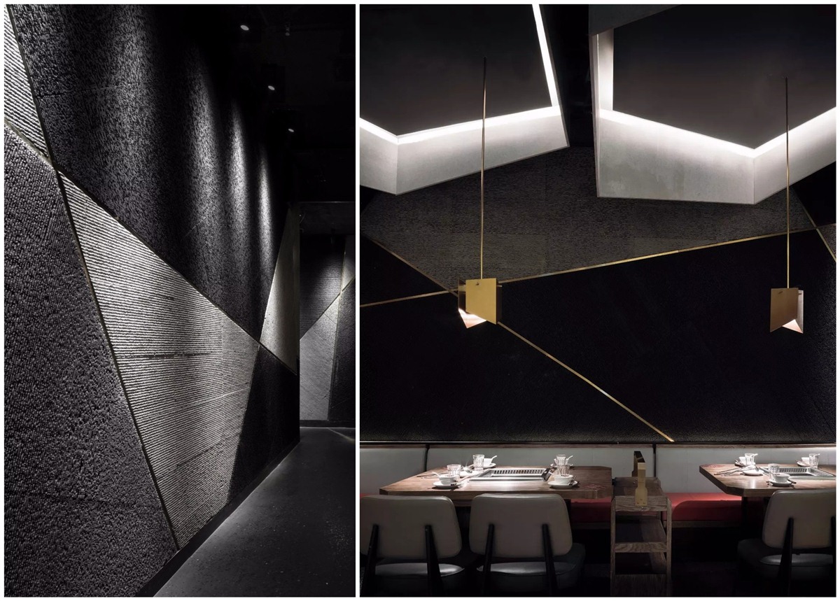 壁面纹理在灯光下反射出神秘的光泽,金属缝条和灯具相呼应,艺术气质。