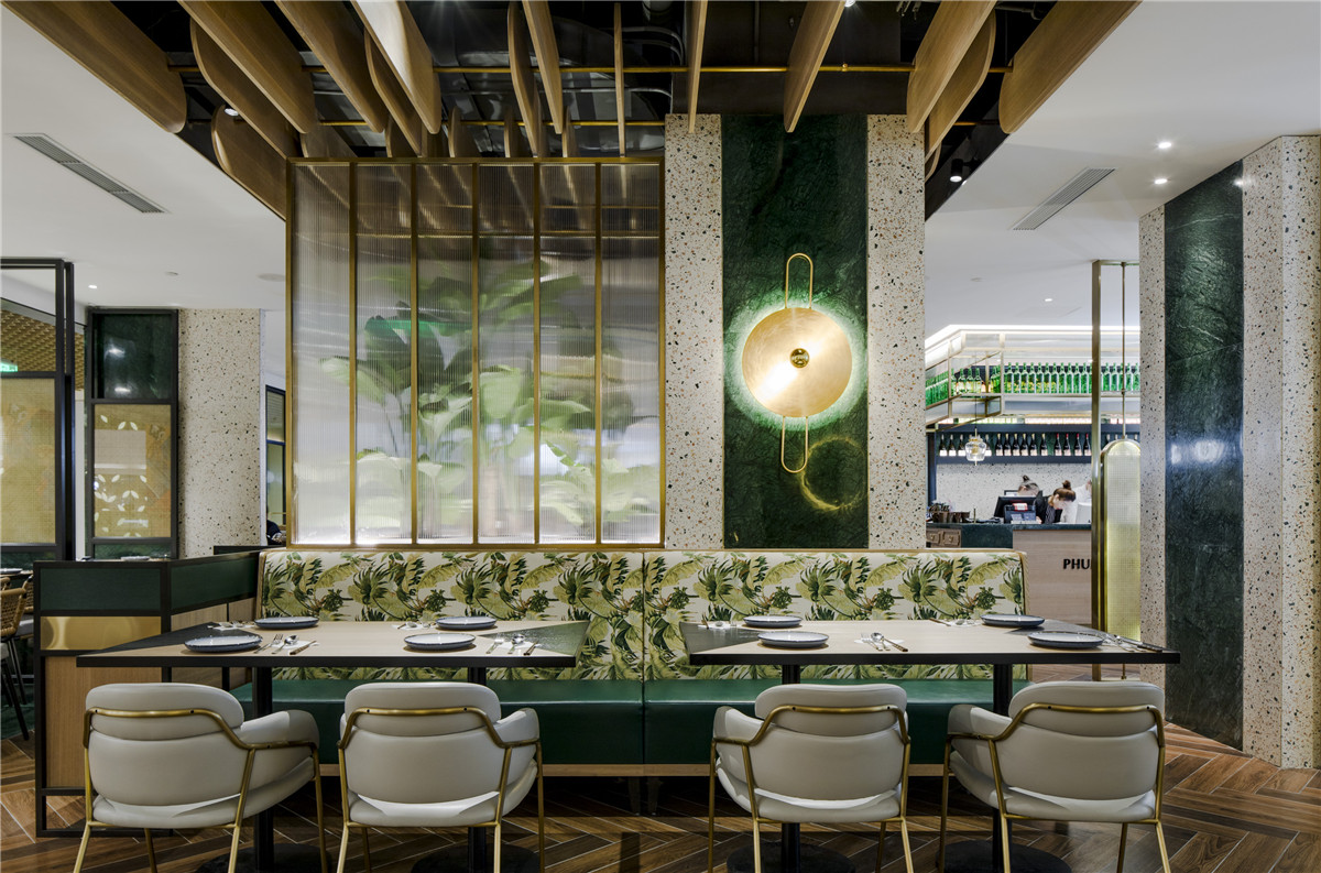 普吉天堂餐厅位于上海市第一百货,伴随着第一百货重新开业,项目也同时启动。餐厅灵感来源于普吉岛的日夜光影变幻。通过印度绿大理石、彩色水磨石、带有热带风情的藤编、木地板、镀铜金属和阳光板编织出一个带有普吉韵味的当代都市餐厅。阳光板和纱帘以及藤编的朦胧感给我们带来了惊喜。