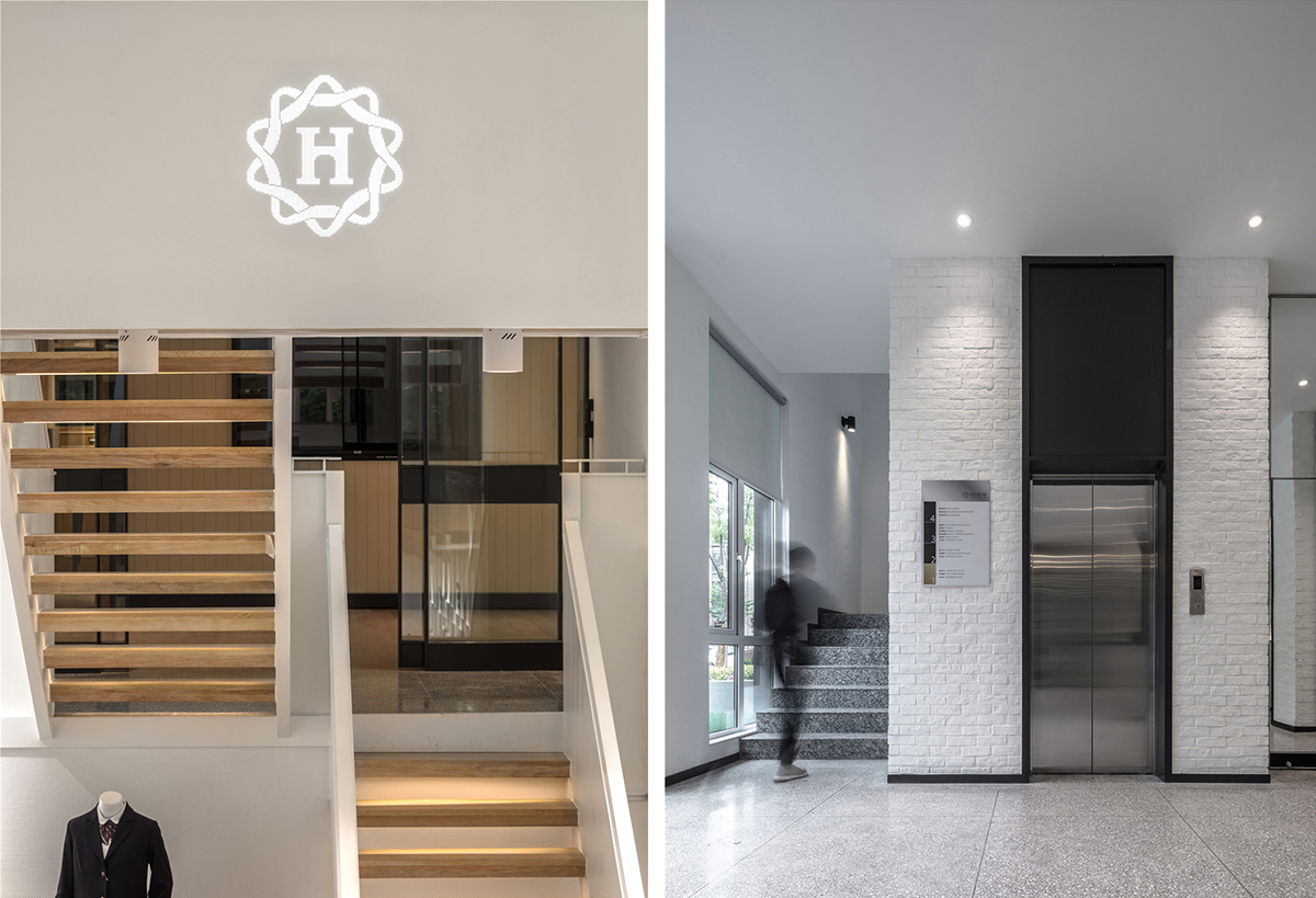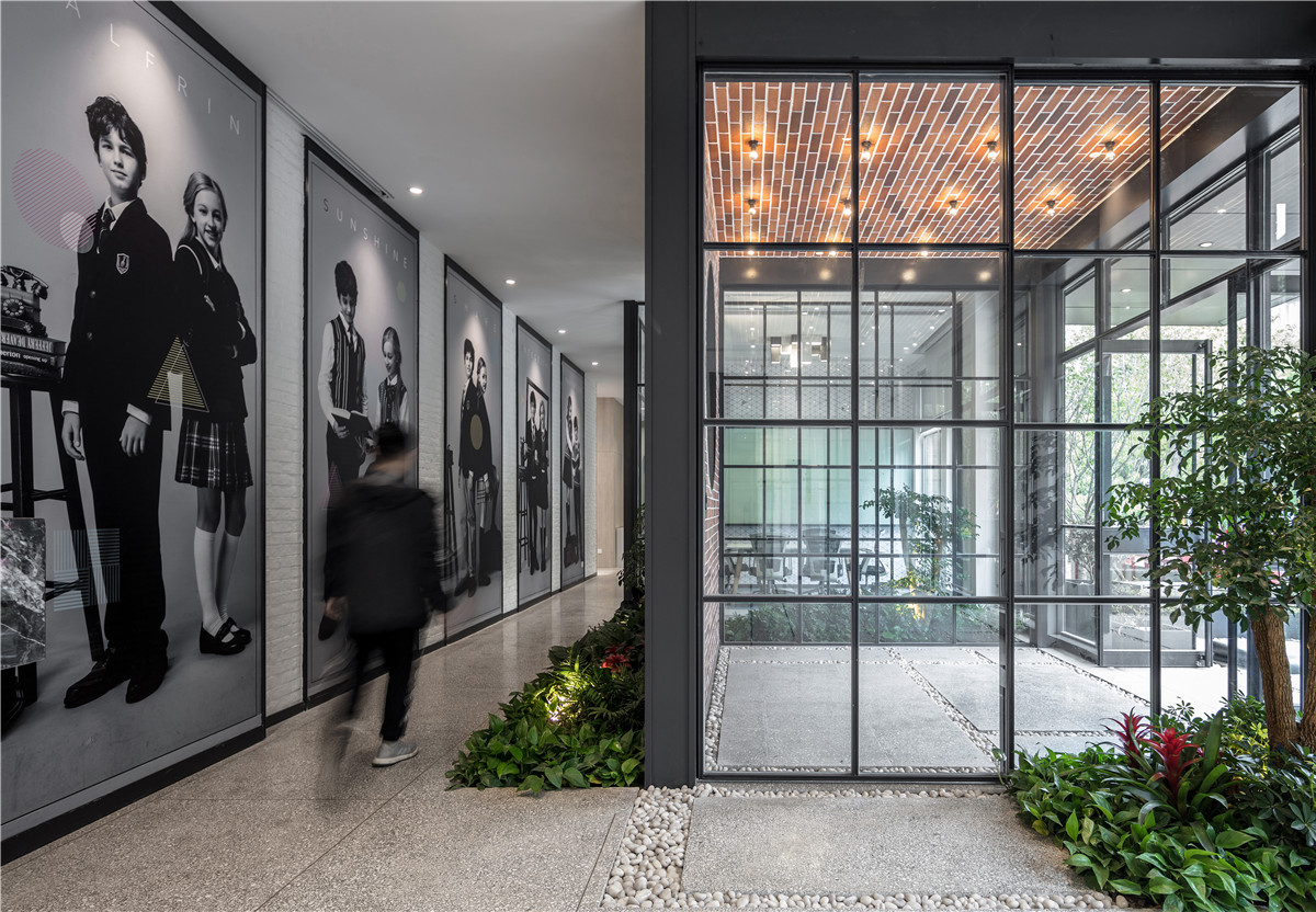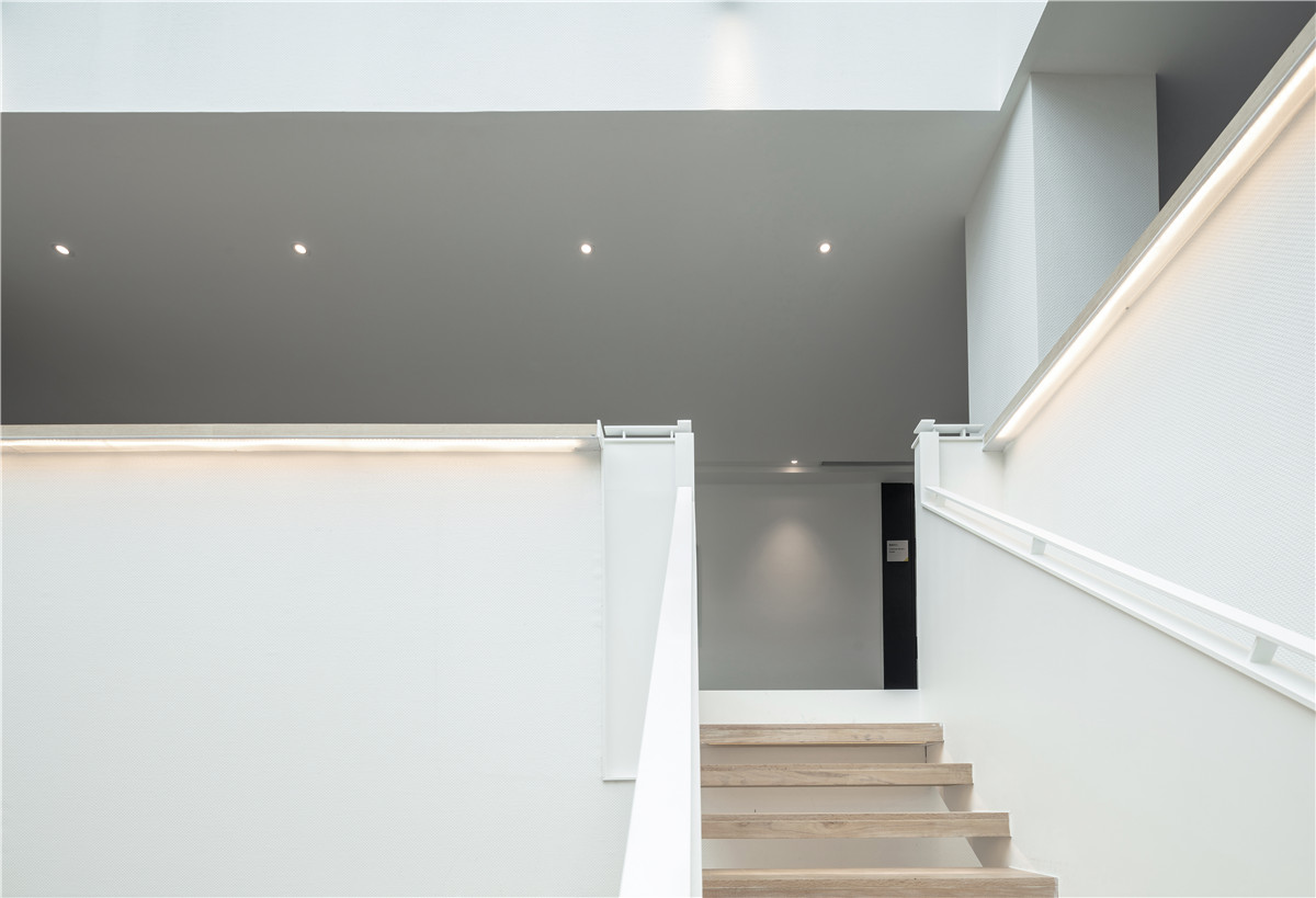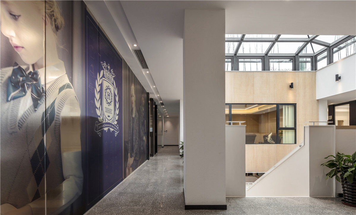 设计师利用校园的一些元素来进行概念设计,空间建筑当中的核心筒空间处理成阶梯教室的形状,同时解决了企业多个功能诉求。企业产品橱窗在这里惊喜呈现,每年两到三次的服装走秀也在这里,戏剧感十足;行业内的培训大课,交流,直接就把这里作为阶梯教室。平日里除了供人往来,更可供员工坐于其上交流、休息。阶梯教室两边的墙面处理成企业发展简介墙,并嵌入多个组装展示活跃空间。