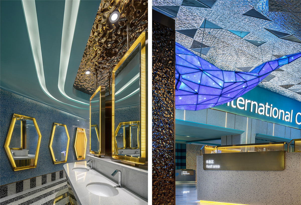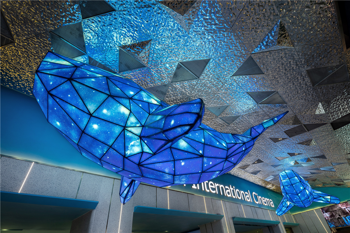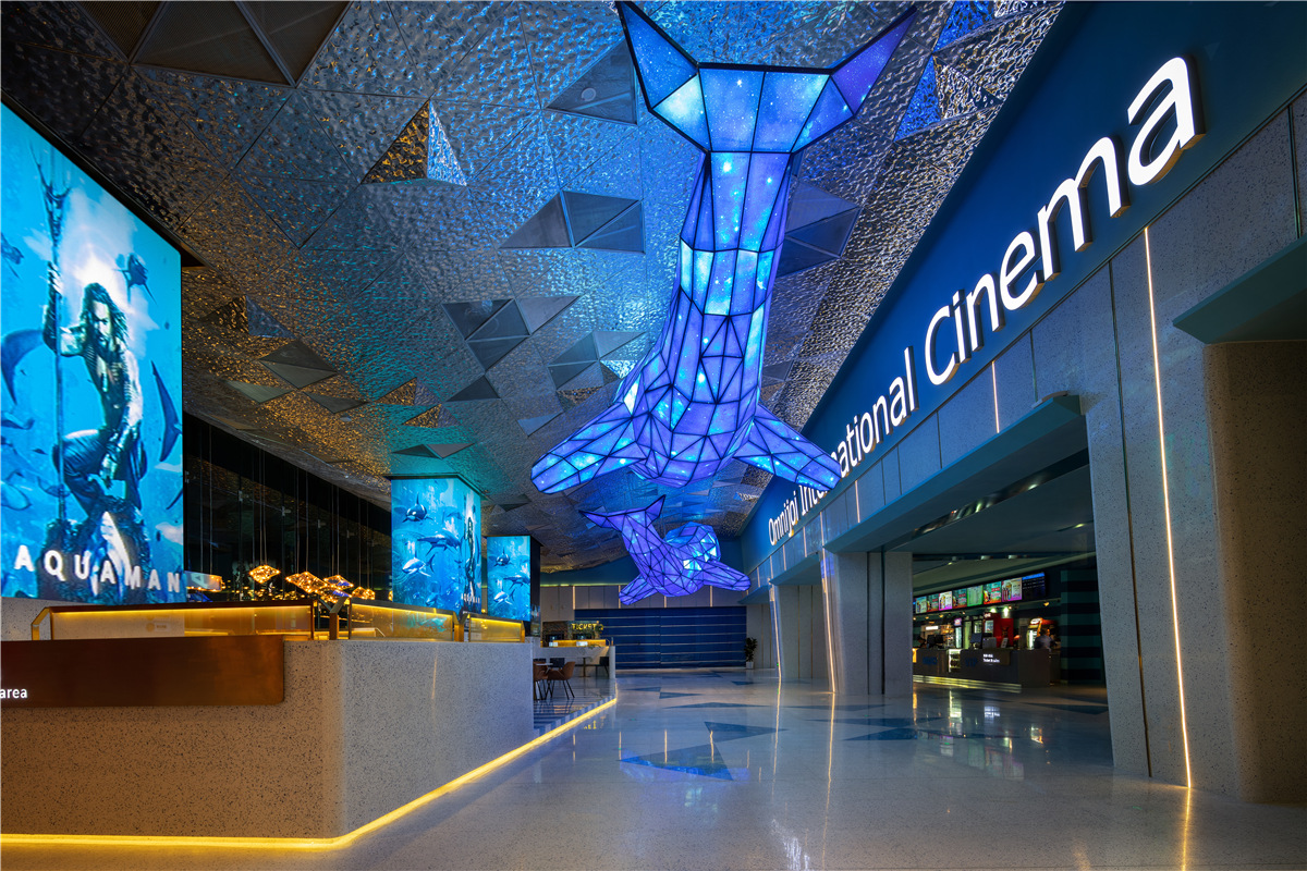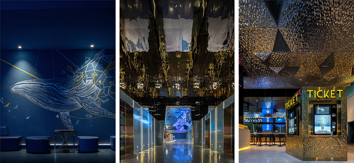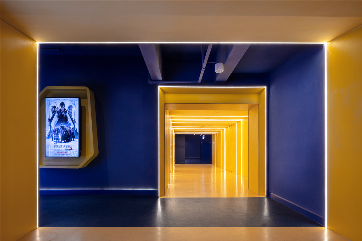本案位于成都高新区仁和新城广场,在依照项目物业条件与区位特点的基础上进行商业模式创新,通过运营与设计相结合,打造商场地标性区域。 设计目标有两点: 1、让前来观影的伙伴在独特的空间里感觉舒服自在,乐于拍照分享,从而留下美好印象; 2、为幸福蓝海院线定制识别度极高,同时符合品牌基因的形象,从而推动品牌的市场影响力。 上瑞元筑团队决定尝试突破以往的公区设计限定,缩小典型化“影视”语境特征,呈现主题化、带入感的生活场景表现。为契合影城品牌文化基因,选择了「海洋」作为设计主题,并用国际化表现手法彰显空间摩登时尚感. 设计师如导演一般,汲取来自海洋的灵感,通过戏剧化的表现,把静谧的汪洋、闪光的波浪、摇曳的蓝鲸和影像元素交织出来。步入大厅,一幅唯美梦幻的意境徐徐展开,引发无限遐想。 叙述体系始终围绕着海洋出发,试图将浪漫的语境融入每一个细节:顶部独具匠心地用立面效果塑造出“蓝鲸”形象,在灯光的映衬下显得栩栩如生,动感十足。 灵魂蓝调悠游环绕,多片波纹金属板紧密地折叠排列,抽象又极具艺术感地模拟了海面波光粼粼的意向,每一处都流淌着清新的气息。波浪此起彼伏,蓝鲸摆尾摇曳,犹如置身纯净海洋世界. 进入观影通道后,线条的流动性加强,设计师巧妙地通过色彩、灯光、图形、影像的综合感觉效应,创造不一样的、当下感的“五觉”体验和空间表情,由公区向功能空间(影厅)从体量到强度进行渐进式虚拟情境营造,柔美灵动,质感十足。 影城整体联纵贯通,局部巧变迂回,设计师根据“场景组别”、“剧情”和品牌基因衍生出的关联意向,摒弃纷繁复杂的结构,追求海洋特有的神韵,鲜明主题贯穿始终,构建了一个影像与空间筑就的美好世界,流溢着大自然的纯真唯美。 空间动线和精神故事线得到无限延展,填充辅助了业态亲和趣味感,将极具特色的建筑设计演绎成生动无比的城市语言,构建了一个影像与空间交织的美好世界。
